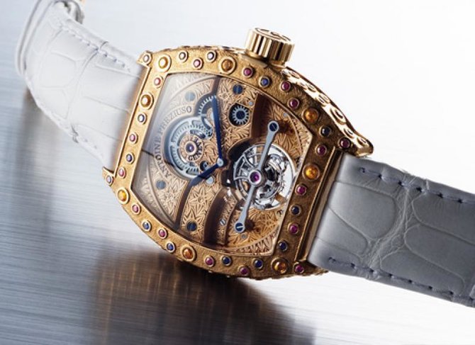 Наручные часы от швейцарской часовой мануфактуры Antoine Preziuso, The Art of Tourbillon, в корпусе бочкообразной формы из розового золота. Корпус инкрустирован сапфирами, рубинами и цитринами. На скелетонизированном гильошированном циферблате индикацию часов и минут обеспечивает мануфактурный швейцарский механический механизм с ручным подзаводом. Размеры корпуса: 42 миллиметра - диаметр; 12 миллиметров - толщина. Герметичность корпуса - 30 метров. К запястью часы крепятся с помощью ремешка из крокодильей кожи с раскладывающейся застежкой. Интересный факт: при первом посещении российской столицы А. Прециузо был приглашен в Кремль, где ему был доверен ремонт старинных часов. С заданием он справился успешно и быстро снискал доверие кремлевского коменданта. Пользуясь случаем, швейцарского мастера попросили профилактически осмотреть все часы Кремля.