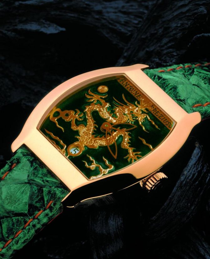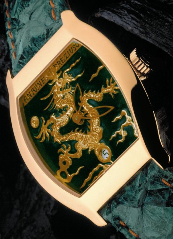 Antoine Preziuso - это швейцарская часовая компания, которая основалась Антуаном Прецзьо в 1996 году. Марка производит часы люкс-класса. В 2008 году фирма вступила в Fondetion de la Haute Horlogerie (FHH) - фонд, основанный тремя учредителями в 2005 году в столице мирового часового мастерства - Женеве. Учредители: Richemont Group, Audemars Piguet и Girard Perregaux. Свои намерения они объяснили так: "В целях поддержки высокого часового искусства в мире". Представленная часовая модель вышла в корпусе из розового золота бочкообразной формы, диаметром 42.5 миллиметров. На циферблате с золотым образом дракона указываются часы, минуты и дата. Заводная головка - рифленая. Автоматический часовой механизм имеет 42-часовой запас хода. Герметичность корпуса составляет 30 метров. Внимание, серия ограничена! Часы поставляются на ремешке из кожи аллигатора с классической застежкой.