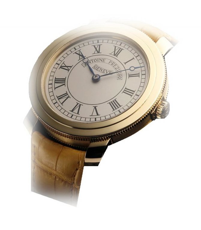 Antoine Preziuso - это швейцарская часовая компания, которая основалась Антуаном Прецзьо в 1996 году. Марка производит часы люкс-класса. В 2008 году фирма вступила в Fondetion de la Haute Horlogerie (FHH) - фонд, основанный тремя учредителями в 2005 году в столице мирового часового мастерства - Женеве. Учредители: Richemont Group, Audemars Piguet и Girard Perregaux. Свои намерения они объяснили так: "В целях поддержки высокого часового искусства в мире". Представленная часовая модель вышла в корпусе из розового золота круглой формы. На белом циферблате с римскими цифрами, воронеными стрелками указываются часы и минуты. Заводная головка - рифленая. Механизм с ручным подзаводом обладает функцией репетира. Герметичность корпуса составляет 30 метров. Часы поставляются на ремешке из кожи аллигатора с классической застежкой. Безель вращающийся.