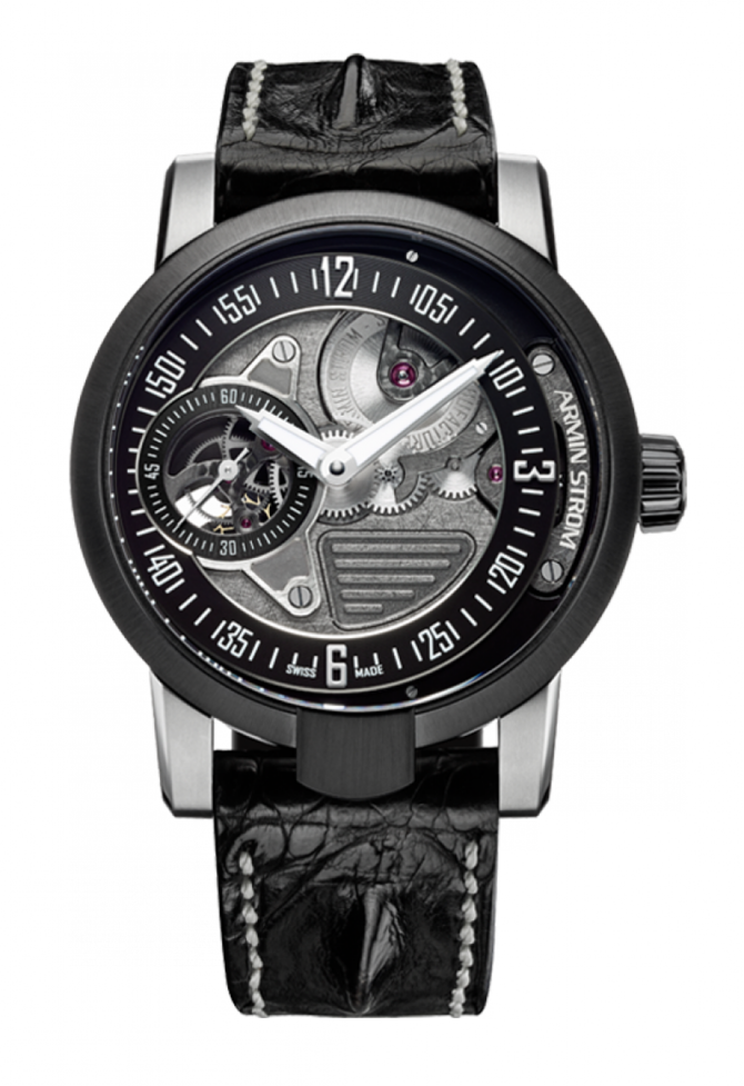 Часовая швейцарская мануфактура Armin Strom представляет мужские наручные часы, функционирующие от мануфактурного автоматического механизма с пятидневным запасом хода. Балансовая частота - 18,000 A/h. Количество драгоценных камней, на которых стоит механизм - 20. Корпус выполнен из нержавеющей стали с черным PVD-покрытием и титана. Сапфировое стекло на страже механизма с двух сторон корпуса - лицевой и задней. Сквозь просвечивающуюся крышку открывается вид на часовой механизм. Диаметр корпуса - 43 миллиметра. Толщина - 13 миллиметров. Герметичность - 50 метров. Материал стрелок и застежки ремешка соответствует материалу корпуса. Застежка - раскладывающаяся. Получив специальность часового мастера, Армин Штром стал специализироваться на реставрации старинных часов. Однако со временем Штром решил во что бы то ни стало создать собственные часы. В 1983 году появился «референс №1 Армин Штром» - часы, которые начали историю мирового бренда.