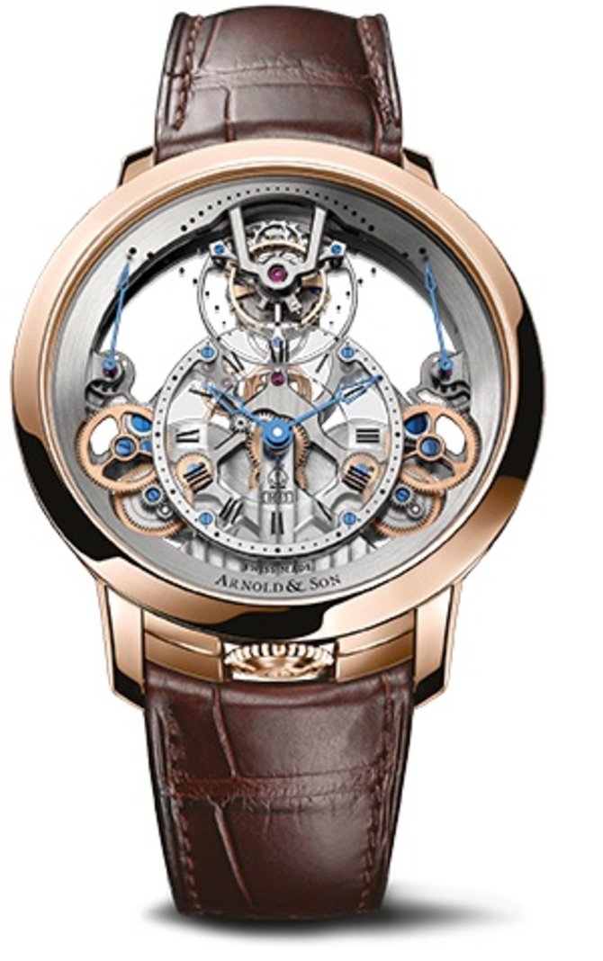 Часы ARNOLD & SON 1TPBR.T01A Instrument Time Pyramid Tourbillon созданы в корпусе круглой формы из розового золота, диаметром 44,60 мм. Лицевая сторона корпуса и задняя защищены сапфировым стеклом с двусторонним антибликовым покрытием. На циферблате-скелетоне размещены указатели таких данных: часы, минуты, секунды, уровня запаса хода, а также находится окно турбийона. Механический механизм A&S8615 с высоким уровнем запаса хода, рассчитанным на 90 часов, выполнен инженерами ARNOLD & SON. Корпус отличается базовой водонепроницаемостью - до 30 метров. На руке часы крепятся ремнем из натуральной кожи аллигатора коричневого цвета, а также застежкой из золота.
