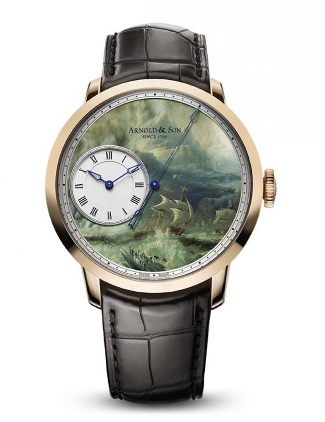 Часовая марка из Великобритании Arnold & Son, производящая наручные часы в центре часовой индустрии - Швейцарии, пополнила список своих часовых шедевров шикарными часами с усложнением "мертвая секунда" ("true-beat seconds") Sir John Franklin Set, вышедшими лимитированным сетом из трех экземпляров по 28 штук каждый в честь памяти о погибшей в Арктике британской военно-морской экспедиции на кораблях Terror и Erebus во главе с Джоном Франклином, которая в 1845 году отправилась на поиски Северо-Западного прохода из Атлантического в Тихий океан. Рисунки на циферблатах моделей - это тематические картины, находящиеся в Национальном морском музее в Лондоне. Круглый часовой полированный корпус выполнен из розового 18-каратного золота. Его диаметр - 44 миллиметра, а водостойкость - 30 метров. Сапфировое стекло стоит на защите механизма с двух сторон корпуса. Циферблат из натурального перламутра, а стрелки - из вороненой стали. Функциональность часов обеспечивает швейцарский мануфактурный механизм с автоматическим подзаводом A&S6103 - шарикоподшипники керамические, на 30 драгоценных камнях, частота баланса - 28800 пк/час, запас хода - 50 часов. Индикация: часы, минуты, секунды.