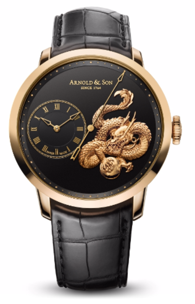 Новинка от британско-швейцарской часовой компании Arnold & Son. Лимитированная модель, вышедшая в количестве 28 экземпляров на весь мир, пополнила часовую коллекцию Instrument. Тщательно полированный корпус часов произведен из розового 18-каратного золота. Диаметр корпуса - 44 миллиметра. Герметичность - 30 метров. Заводная головка с мелким рифлением. Корпус с двух сторон закрыт сапфировым стеклом. С лицевой стороны стекло выпуклое, с нанесением специального двухстороннего антибликового покрытия. На черном циферблате расположены часовые стрелки из розового золота и иллюстрация дракона, наложенная вручную, также из розового золота (22-каратного). Часы работают от швейцарского мануфактурного механизма A&S6103 с автоподзаводом, на 30 камнях, с балансовой частотой - 28800 пк/час, запасом хода - 50 часов, с керамическими шарикоподшипниками. Индикация: часы, минуты, секунды. Секунды отображаются благодаря уникальной функции "мертвая секунда", что в переводе на английский звучит как "true-beat seconds". Загадка аббревиатуры "TB" в названии данных часов, кажется, разгадана.