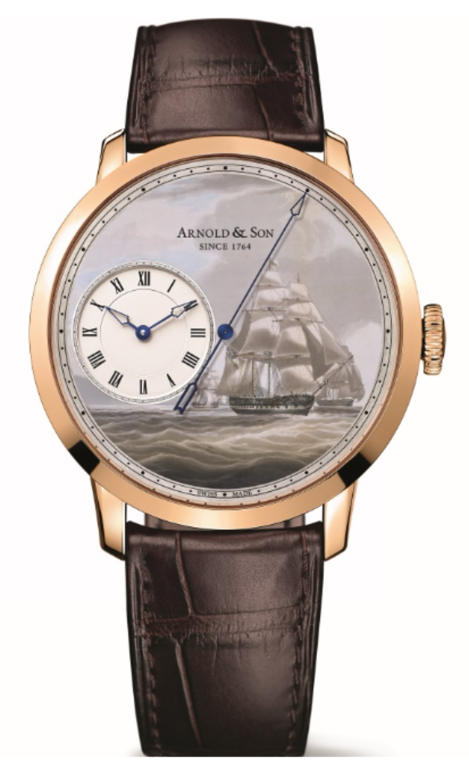 Изысканная художественная модель наручных часов от швейцаро-британской компании Arnold & Son, вышедшая лимитированной серией из 28 экземпляров на весь мир, пополнила коллекцию "Instrument". Элегантный полированный корпус часов изготовлен из розового 18-каратного золота на мануфактуре Arnold & Son. Корпус, диаметром 44 миллиметра, обладает 30-метровой герметичностью. Заводная головка с мелким рифлением для избежания скольжения пальцев. Корпус с двух сторон закрыт сапфировым стеклом. С лицевой стороны стекло выпуклое, с нанесением специального двухстороннего антибликового покрытия. На уникальном циферблате расположены часовые стрелки для индикации текущего времени. Часы работают на базе швейцарского мануфактурного механизма A&S6103 с автоподзаводом и керамическими шарикоподшипниками, на 30 камнях, с балансовой частотой - 28800 пк/час и запасом хода - 50 часов. Секунды отображаются благодаря сложной функции "мертвая секунда". На английском звучит так: "true-beat seconds". От этого и аббревиатура "TB" в названии данных часов.