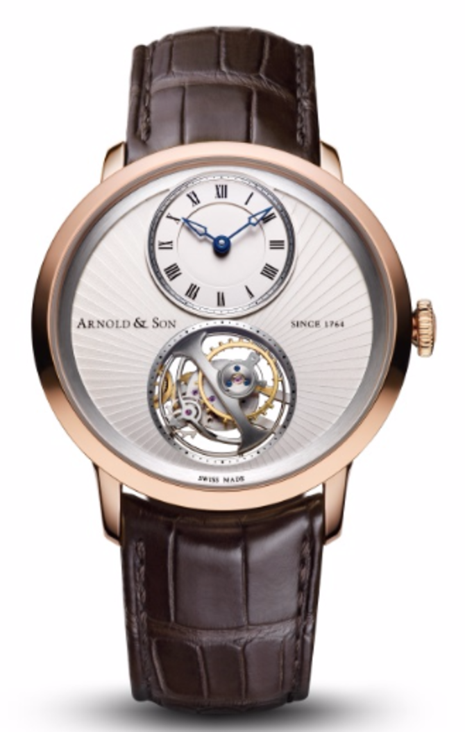 Наручные часы от британского часового бренда, собирающего свои творения в Швейцарии - Arnold & Son. Часы выпущены в круглом полированном корпусе из красного золота. Его диаметр - 42 мм; водостойкость - 30 метров. Рифленая заводная головка расположена в традиционном месте. С двух сторон корпус защищен сапфировым стеклом с антибликовым покрытием. С лицевой стороны оно выпуклое. На циферблате расположились стрелки для индикации часов и минут, а также видно окно турбийона. Внутри корпуса установлен мануфактурный механизм с ручным подзаводом, работающий на 29 драгоценных камнях. Балансовая частота - 21 600 пк/час; запас хода - 90 часов. Калибр ручной работы. Модель поставляется с ремешком из кожи аллигатора и золотой застежкой