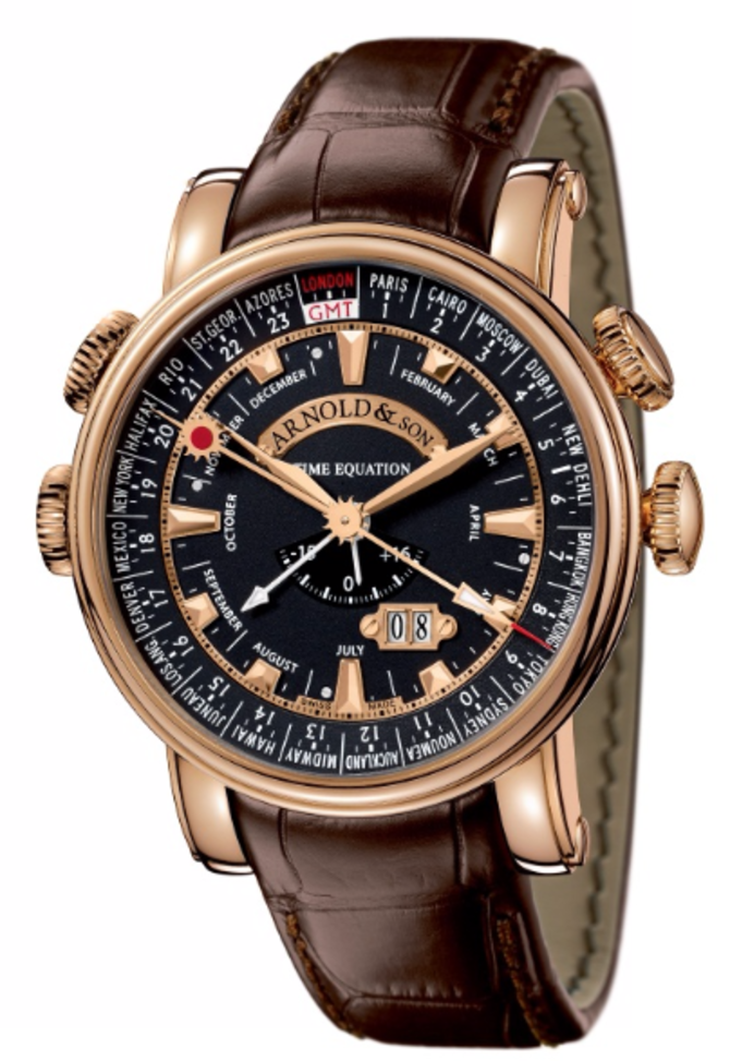 Швейцарские часы Arnold & Son в крупном корпусе круглой формы, выполненном из розового 18-каратного золота. Внутри модели установлен мануфактурный часовой механизм Arnold & Son A1766, функционирующий от ротора автоподзавода. Функции часов "Hornet World Timer": часы, минуты, секунды, дата, месяц, время 24-х городов, солнечное время, уравнение времени. Ремешок, дополняющий часы, пошит вручную из кожи аллигатора. Застежка классическая, выполнена из золота. Увеличенная дата. Три часовых пояса. Водостойкость - 30 метров.