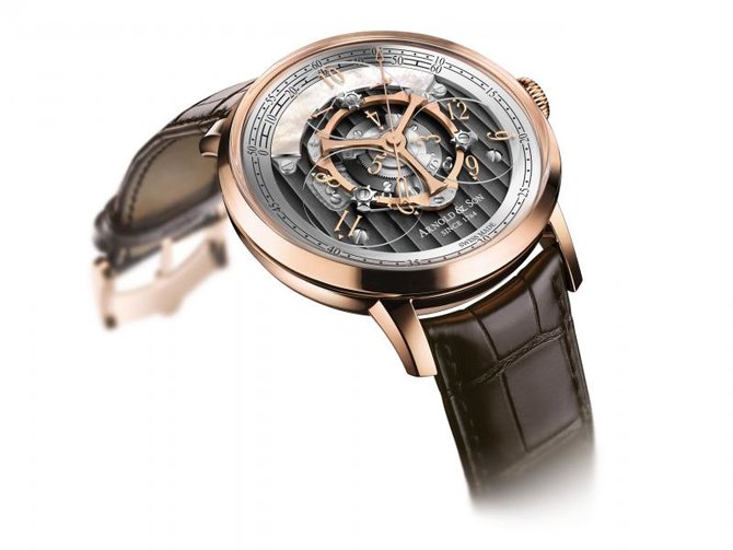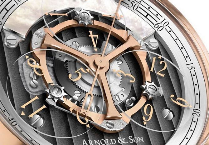 Автоматический механизм A&S6018 новой модели, представленной общественности швейцарской часовой компанией Arnold & Son, помещен в массивный золотой корпус, диаметром 44 мм. На уникальном скелетонизированном циферблате отображаются часы, минуты и секунды. Циферблат с перламутровой вставкой. Перламутр, добытый из морских раковин, искусно выделанный и вставленный в часы, придает им красоту, неподвластную времени. Продукт самой природы представляет собой твердый и радужный внутренний слой некоторых раковин, например, устриц и мидий. Перламутр состоит, в основном, из тонких, наложенных друг на друга, слоев карбоната кальция. Знаменитая радужная игра цветов перламутра создается за счет взаимного наложения отраженных световых волн. Запас хода механизма представленной модели - 50 часов. Часы укомплектованы ремешком из кожи аллигатора коричневого цвета с золотой классической пряжкой для фиксации часов на руке. Максимальная водонепроницаемость - 30 метров. Серия ограничена 125 экземплярами.