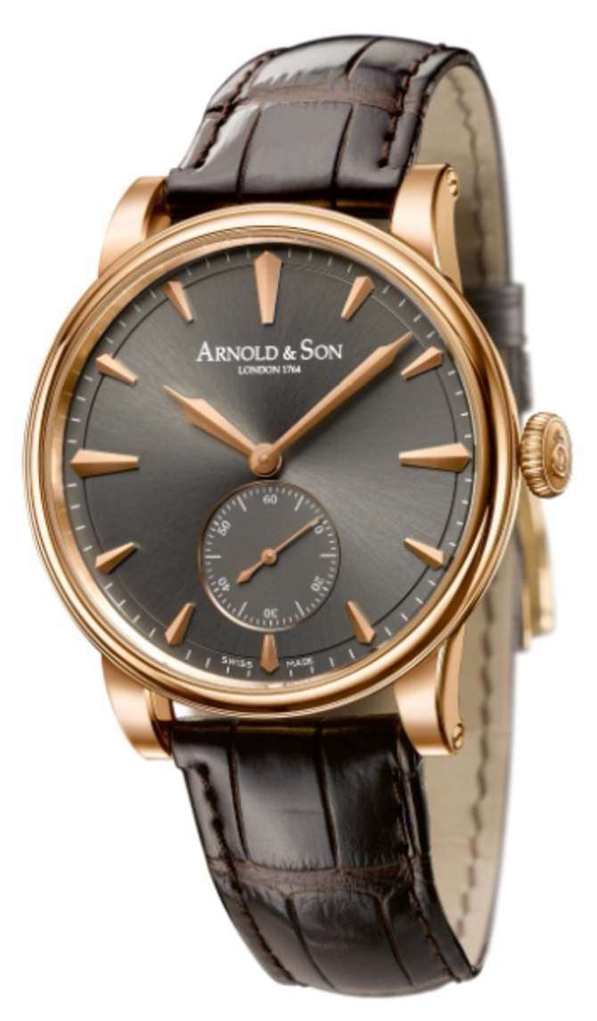 Модель выпущена ограниченным тиражом в 250 экземпляров. Классические швейцарские часы, созданные брендом Arnold & Son, представлены в круглом корпусе из высококачественного розового золота, диаметром 40 миллиметров. Защитное сапфировое стекло, которым покрыт циферблат, с нанесением двустороннего антибликового покрытия. Корпус модели с 30-метровой герметичностью. Функциональность обеспечивает мануфактурный швейцарский механический механизм с ручным подзаводом, калибр A&S1001. Он стоит на 21 драгоценном камне. Запас хода - минимум 90 часов. Балансовая частота - 21600 полуколебаний в час. Задняя крышка выполнена из сапфирового стекла, сквозь которое открывается шикарный вид на работу механизма. Данная модель полностью собрана вручную мастерами мануфактуры Arnold & Son. К запястью часы крепятся с помощью ремешка из натуральной крокодильей кожи с золотой застежкой. На циферблате указываются часы, минуты и секунды (на отдельном субциферблате около отметки в "6 часов").
