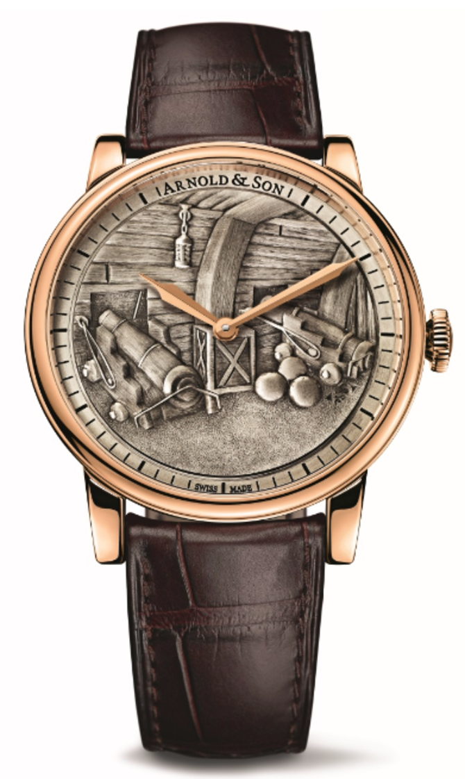 Модель наручных часов от швейцарской часовой компании Arnold & Son выпущена лимитированной версией всего из 28 экземпляров. Часы пополнили ряды коллекции "Royal Collection". Классический корпус, дополненный шикарным художественным циферблатом ручной работы, произведен из розового золота. Диаметр корпуса - 40 мм. Задняя крышка выполнена из натурального сапфирового стекла. Ремешок, которым укомплектованы часы, пошит из кожи аллигатора и наделен классической золотой пряжкой. Водонепроницаемость корпуса равна 30 метрам. Часовой механизм с ручным подзаводом мануфактурного производства Arnold & Son. Запас хода механизма - 90 часов. Он стоит на 21 драгоценном камне. Балансовая частота - 21 600 полуколебаний в час. Данные часы сконструированы со способностью выдерживать индукцию магнитного поля более 15000 гаусс. Этот показатель намного превышает индукцию магнитного поля, которой подвергаются часы в обычных обстоятельствах. Воздействие такого магнитного поля не только не остановит часы, но и не нарушит точность их хода. Циферблат защищается сапфировым стеклом с двойным антибликовым покрытием.