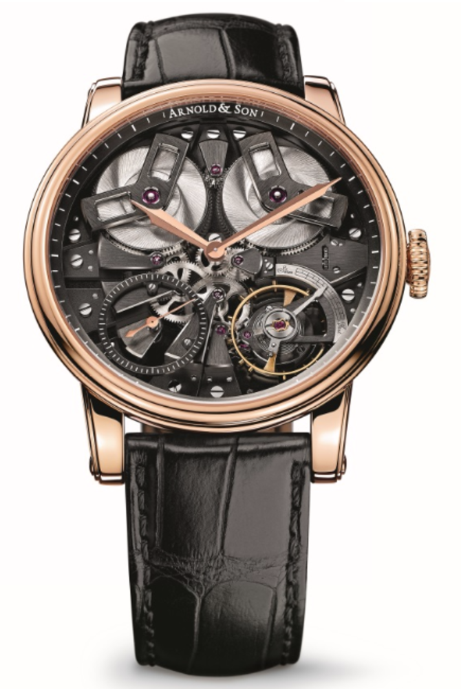 Представленная модель часов от компании Arnold & Son - это точный хронометр, демонстрирующий все основные тонкости механики. Корпус часов произведен из розового 18-каратного золота. Диаметр корпуса - 46 миллиметров. Защитное стекло сапфировое, покрыто двусторонним антибликовым покрытием. Задняя крышка также выполнена из сапфирового стекла, тем самым открывает шикарный вид на работу механизма. Герметичность золотого корпуса - 30 метров. Функциональность обеспечивает мануфактурный механизм с ручным подзаводом и турбийоном, калибр A&S5003. Он стоит на 32 драгоценных камнях. Запас хода - минимум 100 часов. Балансовая частота - 18 000 полуколебаний в час. Секундная стрелка с функцией true beat. Данная модель полностью выполнена вручную мастерами мануфактуры Arnold & Son. К запястью часы крепятся с помощью ремешка из кожи аллигатора с золотой застежкой.