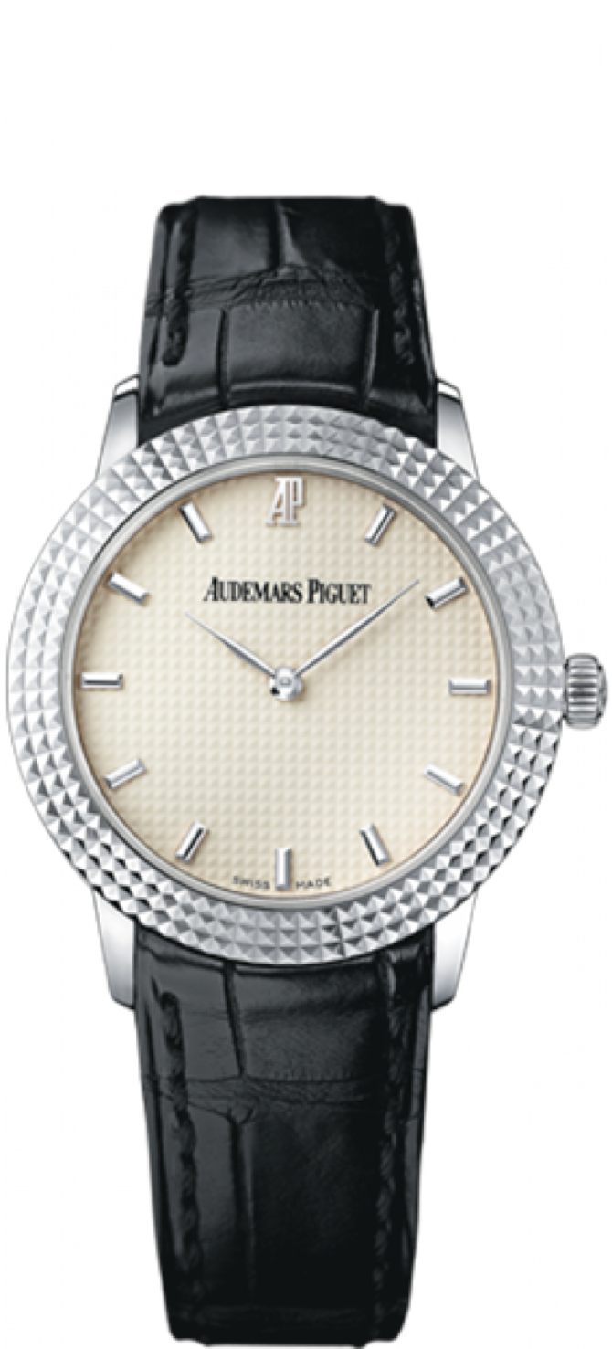 Audemars Piguet Classic Ladies Classique Clous de Paris ref. 77231BC.GG.A002CR.01 Механизм с ручным заводом, Калибр AP 3091 Размеры корпуса 30 х 7 мм Корпус белое золото 18к Функции часы, минуты Циферблат бежевый гильошрованный Запас хода 48 часов Ремешок кожа аллигатора с вставкой из белого золота 18к Дополнительная информация водонепроницаемость 20 м. Секрет успеха заключается и в том, что Audemars Piguet – одна из тех компаний, кто свято хранит свою независимость и самостоятельность, и по сей день принадлежит потомкам своих основателей – Жасмин Oдемар и Полетт Пиге. Подлинная независимость невозможна без собственных механизмов. И Audemars Piguet, помимо сборки и производства эксклюзивных моделей, выпускает механизмы для большей части своих серийных часов, а также для других марок. С начала 2000-х компания инвестирует значительные средства в производство. Сейчас большая часть часов марки оснащена собственным калибром АР3120. Количество выпускаемых в год моделей около 25 000 экземпляров, что позволяет Audemars Piguet держаться над массовостью и достаточно оперативно изменять модельный ряд, все время предлагая новые актуальные идеи. Наконец, ряд роскошных ювелирных моделей в линиях Dream, Deva и Divine удовлетворят самый взыскательный женский вкус. Даже в традиционной линии Royal Oak появляются неожиданные новинки ? например, модель 2009 года Royal Oak Tuxedo, парный комплект для мужчины и женщины со сверхтонким механизмом, чье покрытие циферблата и ремешка напоминает ткань вечернего смокинга.