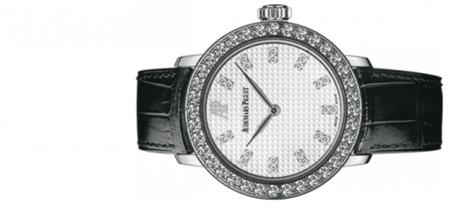 Audemars Piguet Classic Ladies Classique Clous de Paris ref. 77232BC.ZZ.A002CR.01 Механизм с ручным заводом, Калибр AP 3091 Размеры корпуса 30 х 7 мм Корпус белое золото 18к Функции часы, минуты Циферблат белый гильошированный, 22 белых бриллианта Запас хода 48 часов Ремешок кожа аллигатора с вставкой из белого золота 18к Дополнительная информация водонепроницаемость 20 м, безель из 48-и белых бриллиантов 0.76 ct. Секрет успеха заключается и в том, что Audemars Piguet – одна из тех компаний, кто свято хранит свою независимость и самостоятельность, и по сей день принадлежит потомкам своих основателей – Жасмин Oдемар и Полетт Пиге. Подлинная независимость невозможна без собственных механизмов. И Audemars Piguet, помимо сборки и производства эксклюзивных моделей, выпускает механизмы для большей части своих серийных часов, а также для других марок. С начала 2000-х компания инвестирует значительные средства в производство. Сейчас большая часть часов марки оснащена собственным калибром АР3120. Количество выпускаемых в год моделей около 25 000 экземпляров, что позволяет Audemars Piguet держаться над массовостью и достаточно оперативно изменять модельный ряд, все время предлагая новые актуальные идеи.