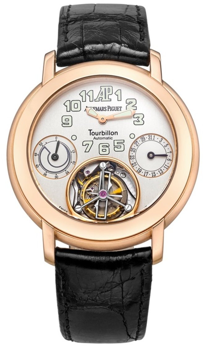 Коллекционная версия швейцарских часов Audemars Piguet, выпущенная в 2001-ом году в честь 150-го Дня Рождения легендарного часовщика, основателя Audemars Piguet - Жюля-Луи Аудемара. Корпус часов выполнен из 18-каратного розового золота в диаметре 40 мм. Толщина корпуса - 11.9 мм. Часовой механизм мануфактурной разработки Audemars Piguet - калибр 2875 с турбийоном. На циферблате, сквозь защитное стекло из сапфира, указываются: часы, минуты, секунды, дата, запаса хода механизма, а также расположено открытое окно турбийона. Запас хода механизма - 54 часа. Механизм функционирует с помощью функции автоматического подзавода. Укомплектована коллекционная модель швейцарских часов ремешком из натуральной кожи аллигатора. Раскладная застежка из розового золота. Балансовая частота механизма - 21 600 пк/час. Количество драгоценных камней в механизме - 40. Задняя крышка часов сделана из розового золота. На нее нанесено уникальное изображение методом ручного гильоширования - солнечные лучи, семейный герб Audemars, а также фраза «JULES AUDEMARS - 150 ANS».