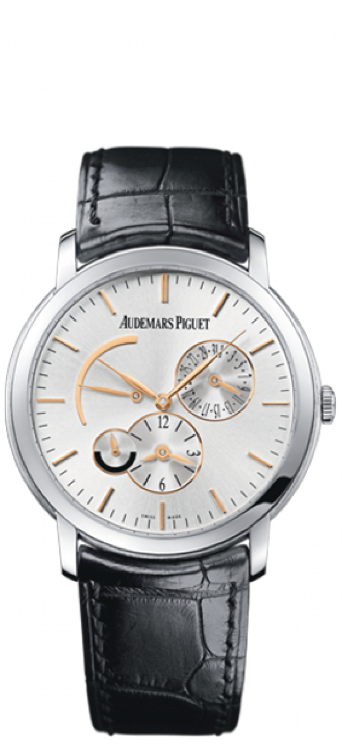 Продаем Швейцарские наручные часы Audemars Piguet Jules Audemars Dual Time ref. 26380BC.OO.D002CR.01 модель Jules Audemars Dual Time. Как видно из названия, она позволяет установить время во втором часовом поясе (с индикацией «день/ночь»), а также информирует о текущей дате и запасе хода механизма. Последний, известный как AP cal. 2329/2846, построен на основе ранее упомянутого базового калибра JLC 899 и модуля второго времени от Dubuis-Depraz, известного своими дополнительными модулями производителя из расположенного не так далеко местечка Ле Льё. Вышеописанная конструкция размещается в корпусе диаметром 41 мм и толщиной 9.25 мм. Бренд Audemars Piguet был основан в 1875 году в городе Ле Брассюсе. Фирма названа по именам своих владельцев, друзей детства – Jules Audemars и Edvard Piguet.