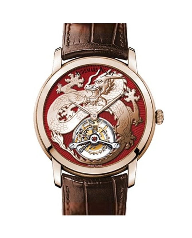 Мужские часы от компании Audemars Piguet, вошедшие в коллекцию "Jules Audemars", представлены в круглом корпусе из розового золота, диаметром 41 миллиметр. Часы выпущены ограниченным тиражом - 8 экземпляров. Герметичность корпуса - 20 метров. На циферблате с миниатюрой дракона, выполненной из золота, указываются часы и минуты. Около отметки "6 часов" размещено окно турбийона. Калибр 2906, установленный в этих часах, работает от ручного подзавода. Запас хода механизма - 72 часа. Ремешок, идущий в комплекте, пошит из натуральной кожи крокодила. Классическая пряжка сделана из золота. Швейцарская мануфактура Audemars Piguet основана еще 1875 году Эдвардом-Огюстом Пиге и Жюлем-Луи Одемаром. Название бренда состоит именно из комбинации фамилий основателей. Штаб-квартира часовой компании находится в швейцарском городе Ле Брассю. Лучшие изделия бренда хранятся в Британском музее. В кинофильме "Терминатор 3" на руке главного героя блеснуло произведение Audemars Piguet, разработанное инженерами компании совместно с А. Шварценеггером. Среди пользователей швейцарских часов Audemars Piguet числятся Лео Месси, Михаэль Шумахер, Криштиано Роналду, Арнольд Шварценеггер, Jay-z, Дольф Лундгрен, Хью Джекман, Скарлетт Йоханссон, Кэтрин Зета-Джонс и другие всемирно известные персоны.