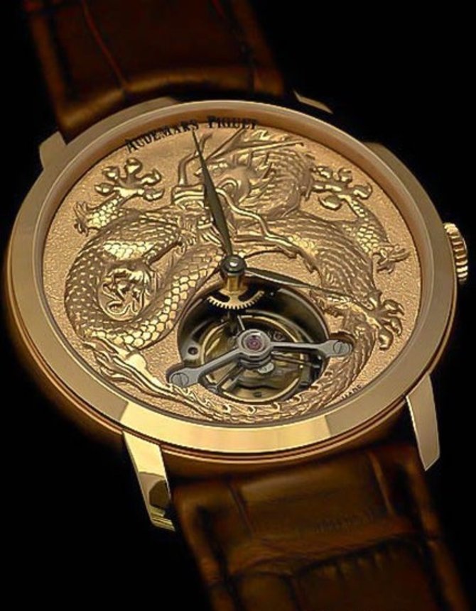 Мужские часы от компании Audemars Piguet, вошедшие в коллекцию "Jules Audemars", представлены в круглом корпусе из розового золота, диаметром 41 миллиметр. Часы выпущены ограниченным тиражом - 8 экземпляров. Герметичность корпуса - 20 метров. На полностью золотом циферблате с вылитой миниатюрой дракона указываются часы и минуты. Около отметки "6 часов" размещено окно турбийона. Калибр 2906, установленный в этих часах, работает от ручного подзавода. Запас хода механизма - 72 часа. Ремешок, идущий в комплекте, пошит из натуральной кожи крокодила. Классическая пряжка сделана из золота. Швейцарская мануфактура Audemars Piguet основана еще 1875 году Эдвардом-Огюстом Пиге и Жюлем-Луи Одемаром. Название бренда состоит именно из комбинации фамилий основателей. Штаб-квартира часовой компании находится в швейцарском городе Ле Брассю. Лучшие изделия бренда хранятся в Британском музее. В кинофильме "Терминатор 3" на руке главного героя блеснуло произведение Audemars Piguet, разработанное инженерами компании совместно с А. Шварценеггером. Среди пользователей швейцарских часов Audemars Piguet числятся Лео Месси, Михаэль Шумахер, Криштиано Роналду, Арнольд Шварценеггер, Jay-z, Дольф Лундгрен, Хью Джекман, Скарлетт Йоханссон, Кэтрин Зета-Джонс и другие всемирно известные персоны.
