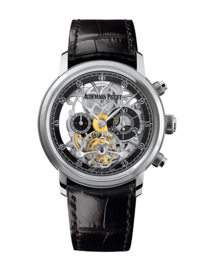 Модель швейцарских часов от компании Audemars Piguet, вошедшая в коллекцию "Jules Audemars", представлена в корпусе из белого золота, диаметром 41 миллиметр и толщиной 13.3 миллиметров. К основным часовым усложнениям можно отнести: турбийон и хронограф. Герметичность корпуса - 20 метров. На скелетонизированном циферблате указываются часы, минуты, секунды и данные хронографа, а также расположено шикарное окно турбийона. Мануфактурный калибр AP 2936, установленный в этих часах, с ручным подзаводом. Ремешок, идущий в комплекте, пошит из крокодильей кожи. Классическая пряжка сделана из белого золота.