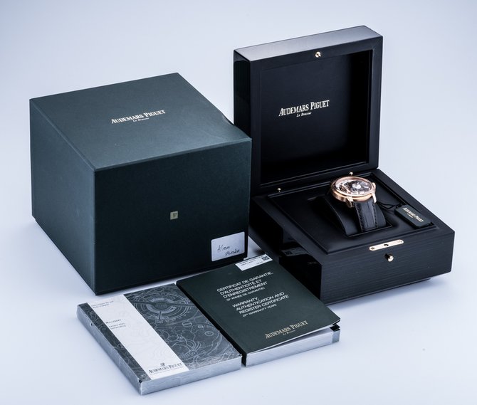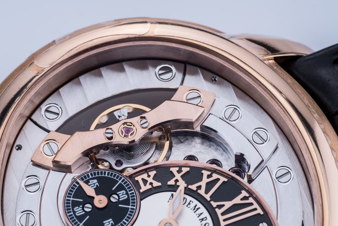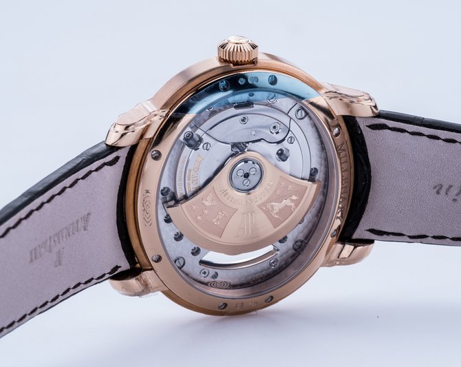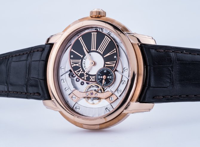 Представленные в начале этого года и совсем недавно поступившие в продажу, Millenary 4101 от AUDEMARS PIGUET воплощали основную идею - сделать для их владельца видимой работу мануфактурного механизма без того чтобы переворачивать к себе их обратной стороной. Полностью мануфактурный механизм, калибр 4101, с ротором автоподзавода из 22К золота, имеет 60-часовой запас хода. Баланс переменной инерции, с фирменными для линейки 8 регулировочными грузами и плоской спиралью Breguet, колеблется с частотой 28 800 пк/час. Механизм овальной формы состоит из 253 компонентов, включая 34 камня, мосты и платина механизма, для придания видимого объема, отшлифованы в разных стилях, все грани скошены и отполированы. Корпус 47мм на 43 мм и высотой в 13мм выполнен из 18К розового золота, стекла – сапфировые. Водостойкость 20 метров. Нецентральный циферблат с часовой и минутной стрелками, а так же циферблат маленькой секунды установлены непосредственно на мостах механизма.
