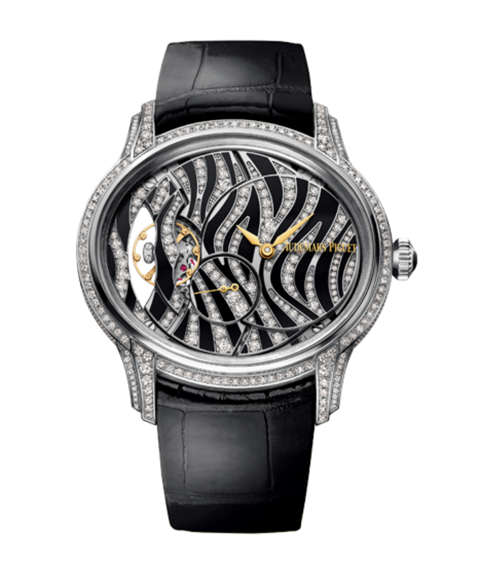 Новинка от швейцарского часового бренда Audemars Piguet - механические швейцарские часы со скелетонизированным циферблатом "Hand-Wound 77249BC.ZZ.A102CR.01", которые пополнили стильную часовую коллекцию "MILLENARY". Данная модель была официально представлена на престижной международной часовой выставке SIHH 2016, которая ежегодно проводится в середине января в Женеве. Из особенностей модели стоит отметить скелетонизированный циферблат, ручной подзавод, запас хода в 49 часов, а также инкрустацию корпуса из белого 18-каратного золота большим количеством бриллиантов. Балансовая частота механизма - 3.00 Гц (21 600 пк/час). Камней в механизме - 19. Всего механизм состоит из 344 элементов. Корпус часов выполнен из белого золота. Диаметр корпуса - 39.5 миллиметр; толщина - 9.8 миллиметров. Циферблат-скелетон защищен сапфировым стеклом. Часовые метки и стрелки на циферблате - из золота. Герметичность корпуса не высокая - 20 метров. Элементы циферблата покрыты люминесцентным покрытием для комфортной читабельности в темное время суток. Модель укомплектована ремешком из кожи аллигатора с классической пряжкой AP. Всего бриллиантов на корпусе - 578, общий вес которых более 2 карат. В 2016 году часовая мануфактура Audemars Piguet выпустила множество интересных часовых разработок, которые разрушают привычные часовые традиции и отличаются независимостью, современностью и смелой динамикой.