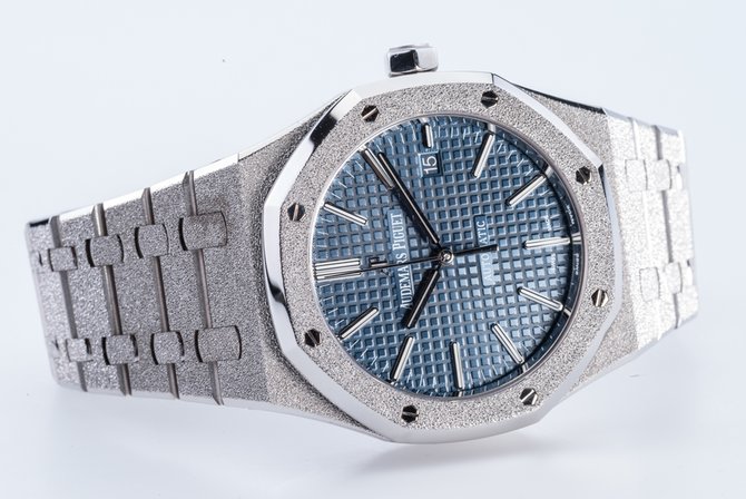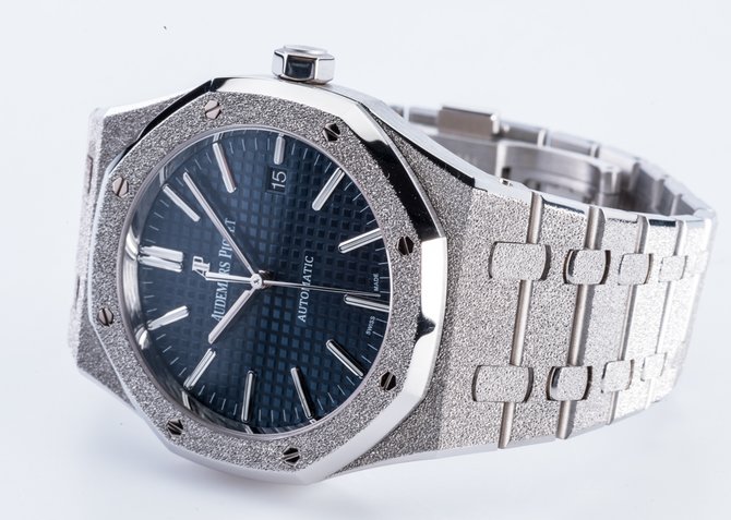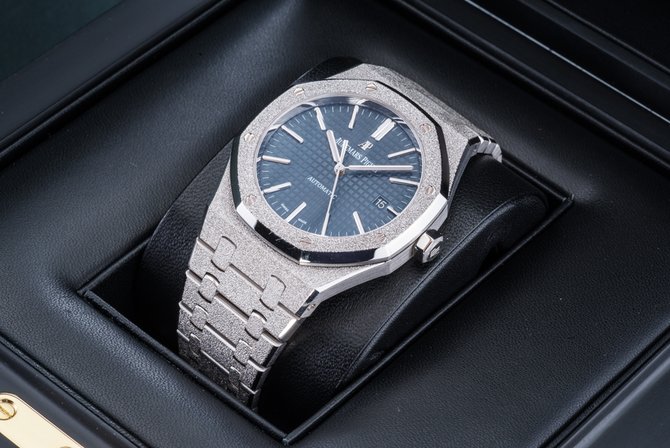 Автоматические часы от швейцарской компании Audemars Piguet, выпускающей модели люкс-класса. Версия Royal Oak Frosted Gold 41 mm (реф. 15410BC.GG.1224BC.01) отличается корпусом из кованого белого золота 750-й пробы, который мерцает при попадании на него ярких лучей света. Из этого же золота произведен и браслет часов. Шикарный аксессуар выпущен лимитированной серией в 200 экземпляров. Лицевое защитное стекло, которым накрыт синий гильошированный циферблат с узором "Grande Tapisserie", выполнено из сапфирового кристалла с антибликовым эффектом. Стрелки покрыты люминесцентным составом. Герметичность корпуса до 50 метров. Диаметр корпуса 41 мм. Толщина - 9.8 мм. Накладные часовые метки и стрелки из золота. Застежка раскладного типа выполнена в фирменном стиле AP.