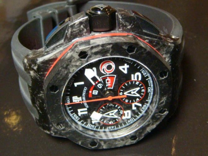 Royal Oak Offshore Alinghi Team Chronograph выпущены компанией Audemars Piguet специально к кубку Америки по парусной регатте, которая проходит каждый год, в честь продолжения сотрудничества с командой Alinghi. Изданные ограниченным тиражом в 1300 экземпляров, удароустоучивый корпус, выполнен из карбона, благодаря чему, часы очень легкие (всего 100 грамм) и комфортные в носке. Изготовленные в Лебрасусе часы имеют функцию flyback-хронографа и 10-минутного яхт-таймера обратного отсчета приспособленного для тайминга регаты в соответствии с 11-минутным правилом. А именно, первый сигнал дается за 11 минут до старта - нажимаем кнопку на 2 часах, следующий сигнал - через минуту - нажимаем кнопку на 4 часах, при этом центральная секундная стрелка обнуляется и снова начинает отсчет, а на апертуре на 3 часах цифра 10. Следующий сигнал дается за пять минут до старта, после этого сигнала запрещается сторонняя помощь и наконец стартовый выстрел - при этом на апертуре снова 10, а маленький 20-ти минутный циферблат в положении 9 часов показывает 10 минут. Хронограф собран на автоматическом калибре 2326/2848, 50 драгоценных камней, имеет запас хода 60 часов, частота 28800 пк/час.