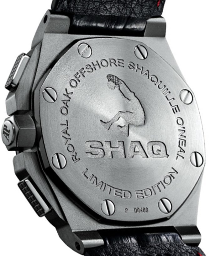 В традиционном для моделей Audemars Piguet Royal Oak Offshore корпусе из нержавеющей стали, диаметром 48 миллиметров, выпущены швейцарские наручные часы Shaquille ONeal Chronograph (Ref. 26133ST.OO.A101CR.01) в честь легендарного американского баскетболиста мирового уровня, больше всего прославившегося своими играми за клуб "Лос-Анджелес Лейкерс" - Шакила О’нила. Часы работают на базе установленного механизма AP caliber 3126/3840 от Audemars Piguet с хронографом, запасом хода на 60 часов и автоподзаводом, который способствует индикации на черном циферблате таких данных: часов, минут, секунд, показаний хронографа, даты. Циферблат гильоширован вручную мастерами Audemars Piguet. Стрелки для индикации данных покрыты люминесцентным составом. Лимитированный тираж этой версии наручных часов Audemars Piguet составляет 960 экземпляров. На заднюю крышку нанесена гравировка с содержанием "Royal Oak Offshore Shaquille ONeal - Limited Edition" и логотипом в виде Шакила во время игры. Комплектуются часы ремешком из кожи аллигатора черного цвета с красной строчкой.