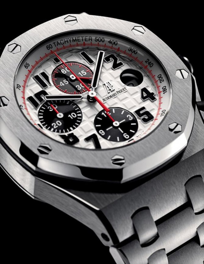 Корпус механических наручных часов Audemars Piguet Royal Oak Offshore Chronograph выполнен из нержавеющей стали. Заводная коронка и кнопки с винтовой блокировкой покрыты черным каучуком. Посеребренный циферблат с узором «Méga Tapisserie». Черные счетчики. Арабские цифры и стрелки из белого золота с люминесцентным покрытием. Посеребренный внутренний безель с тахометрической шкалой. Сапфировое стекло. Браслет из нержавеющей стали с раскладывающейся застежкой.