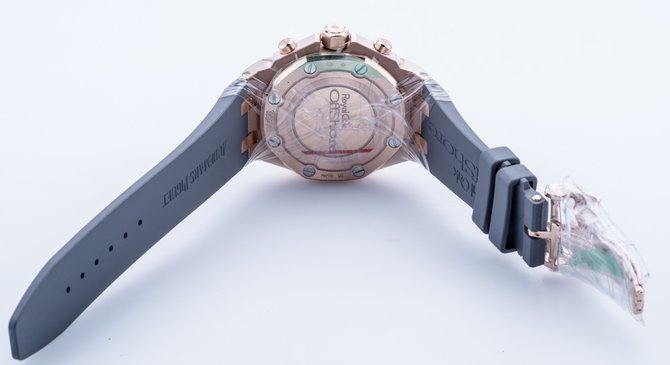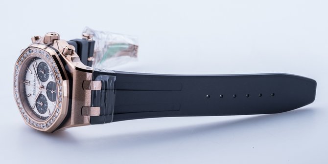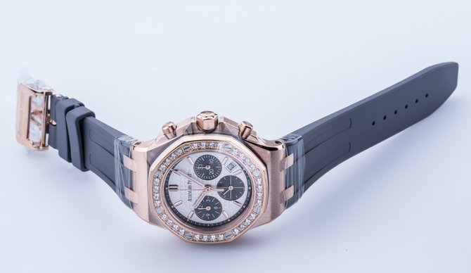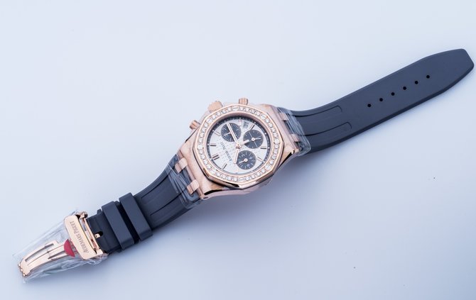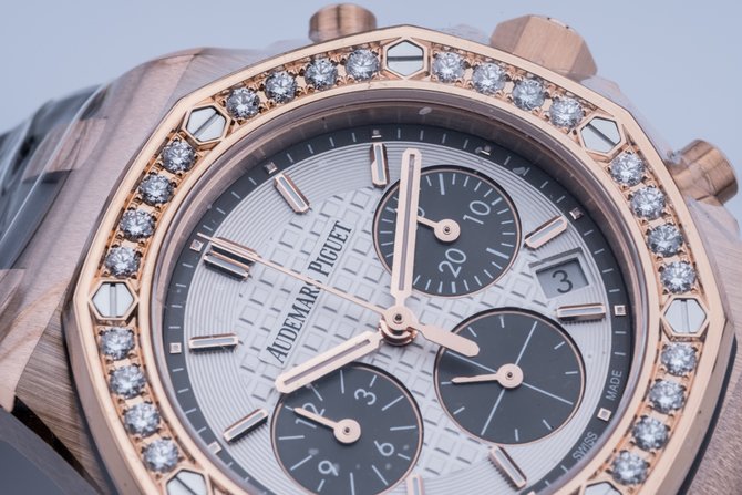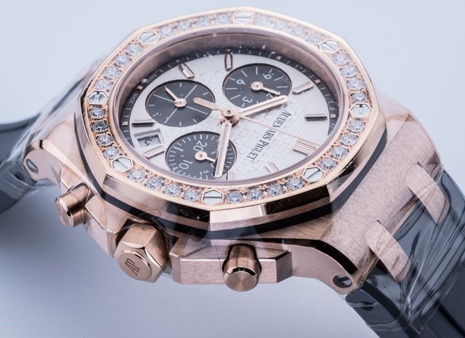 Золотой корпус швейцарских часов с хронографом от Audemars Piguet инкрустирован 32 белыми бриллиантами классической огранки 1,02 карата. Стекло выполнено из сапфирового кристалла. Циферблат гильошированный вручную. Основные функции модели - индикация часов, минут, секунд, даты и данных хронографа. Корпус произведен из розового 18-каратного золота, размером 37мм. Ремень выполнен из каучука серого цвета. Стрелки и метки часов - из золота. Они покрыты люминесцентным составом. Внутри корпуса установлен механизм с автоматическим подзаводом, калибр 2385 с запасом хода 40 часов.