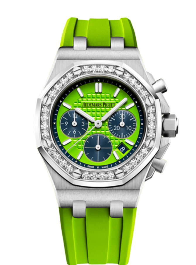 В ювелирный 37-миллиметровый корпус помещен калибр 2385 от мануфактуры Audemars Piguet, который способствует работе главных функций и часовых усложнений, а в модели ROYAL OAK OFFSHORE SELFWINDING CHRONOGRAPH они такие: часы, минуты, секунды, дата, данные хронографа. Механизм с автоматическим подзаводом, запасом хода на 40 часов работы, частотой баланса 3 Гц, что состоит всего из 304 компонентов. Гильошированный циферблат закрывается стеклом из прочного сапфирового кристалла с антибликовым покрытием. Корпус из стали с инкрустацией классическими бриллиантами, весом более 1 карата.