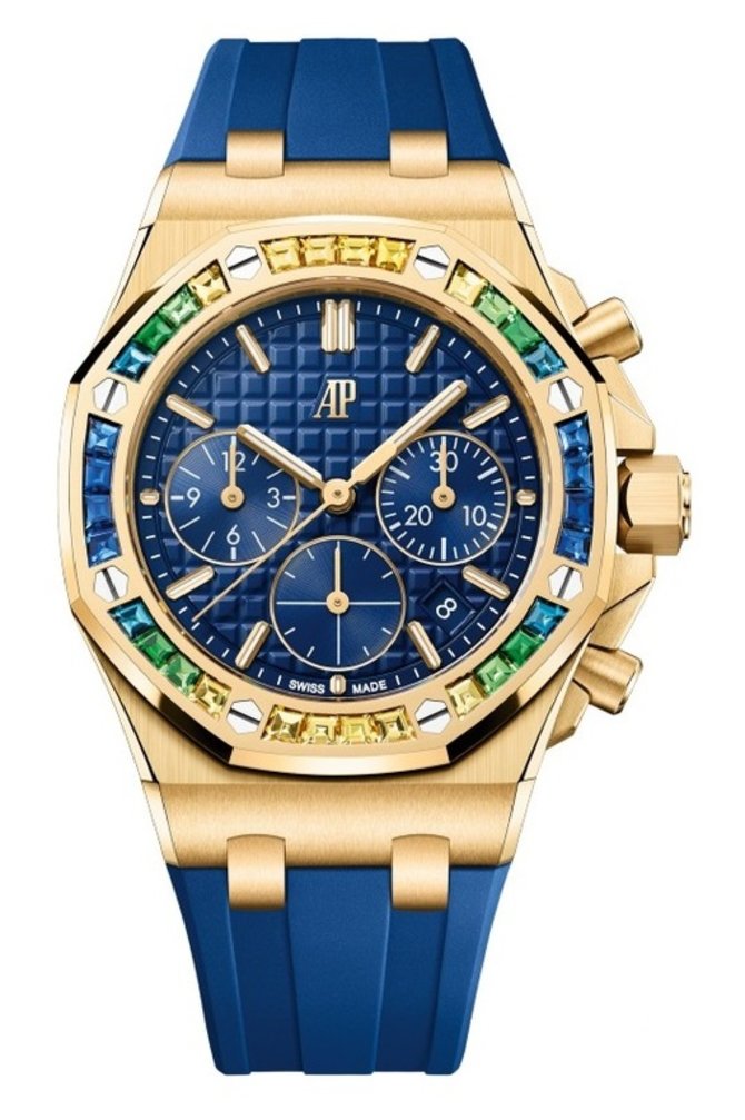 Швейцарская часовая мануфактура Audemars Piguet в 2023 году представила модель наручных часов с хронографом Royal Oak Offshore Chronograph 26236BA.YY.D346CA.01 в корпусе из розового золота с 50-метровой водонепроницаемостью. Безель инкрустирован драгоценными камнями. Диаметр корпуса: 37 мм. Автоматический механизм (калибр AP 2385) мануфактурного производства Audemars Piguet обладает запасом хода на 40 часов. Сквозь выпуклое защитное стекло из сапфирового кристалла на синем гильошированном циферблате демонстрируются часы, минуты, секунды, дата. Часовые метки и стрелки покрыты люминесцентным составом. Каучуковый браслет дополнен золотой застежкой.