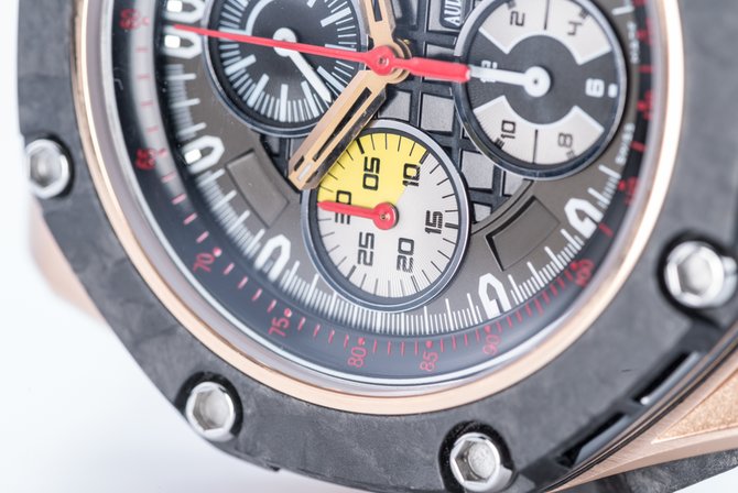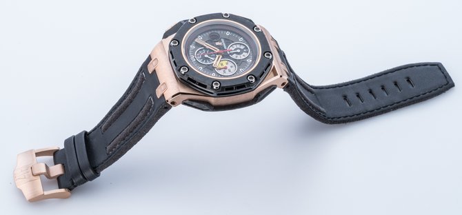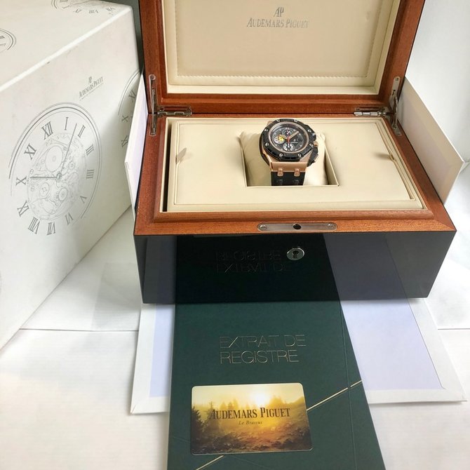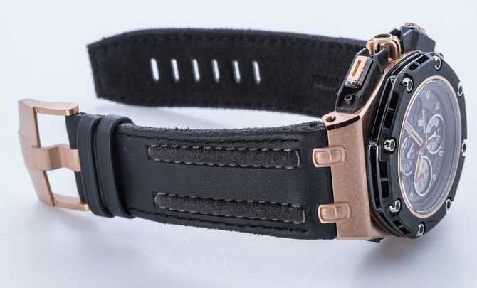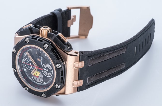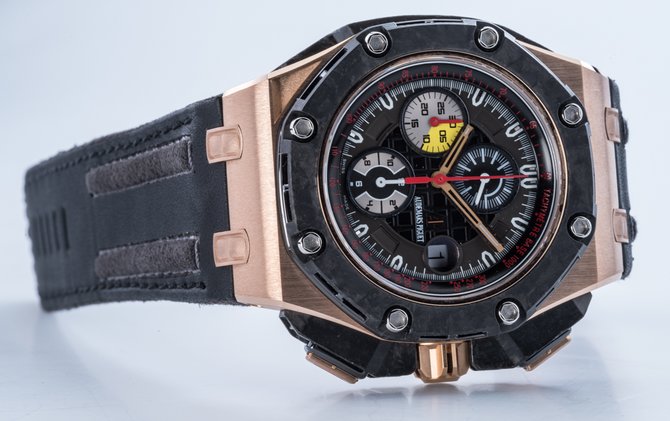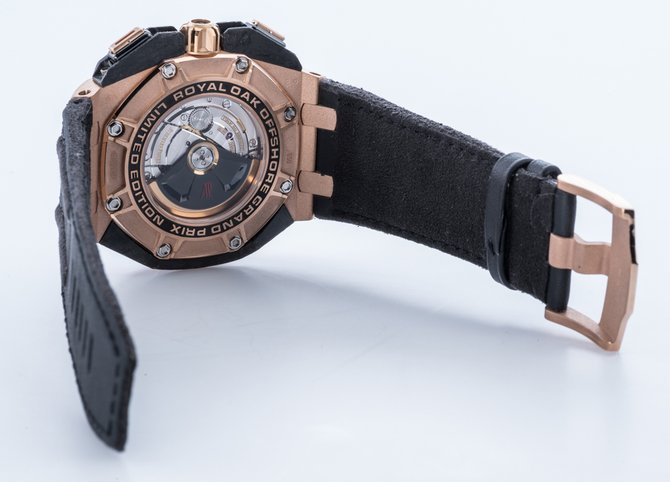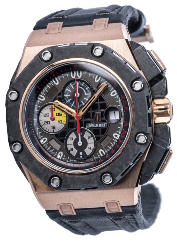Механические часы с автоматическим подзаводом и хронографом от швейцарской часовой мануфактуры Audemars Piguet, модель Royal Oak Offshore Grand Prix Chronograph 26290RO.OO.A001VE.01, что была выпущена в корпусе из розового золота в комбинации с карбоном и керамикой ограниченной серией 650 экземпляров на весь мир. Внутри корпуса, размером 44 x 15.65 мм, установлен мануфактурный калибр AP 3126/3840 с запасом хода на 60 часов работы без подзавода. На закрытом стеклом из сапфирового кристалла гильошированном циферблате расположена тахиметрическая шкала. Также на нем показываются данные текущего времени, дата и показания спортивного усложнения - хронографа. Модель комплектуется черным кожаным ремнем с золотой пряжкой. Водонепроницаемость корпуса - 100 метров. Часы в идеальном состоянии после репассажа на фабрике с заменой безеля.