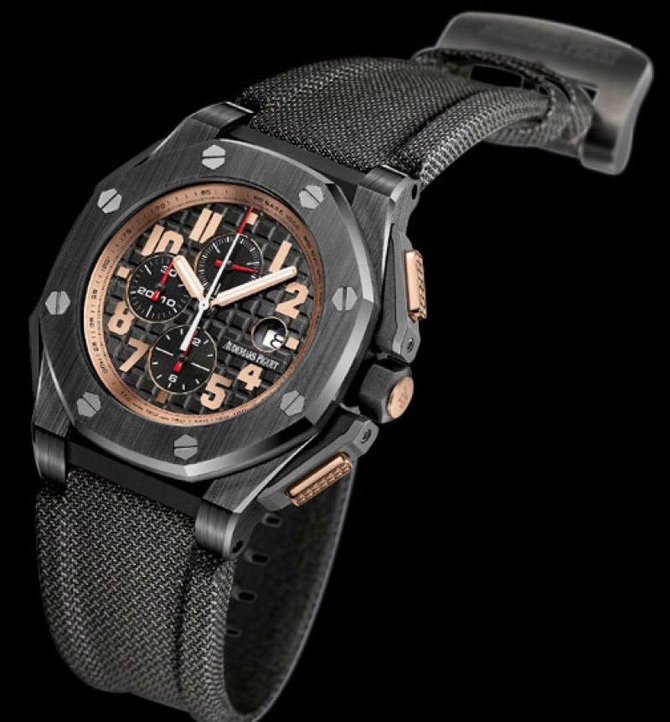 Audemars Piguet представляют новую модель 2011 года. Royal Oak Offshore Arnold Schwarzenegger Legacy в стиле Арнольда Шварценеггера - большой керамический корпус 48 мм, крутой текстильный ремешок (ремешок из кожи аллигатора также входит в комплект). Черный керамический корпус и безель, 48 мм, титановые винты, золотые кнопки хронографа.