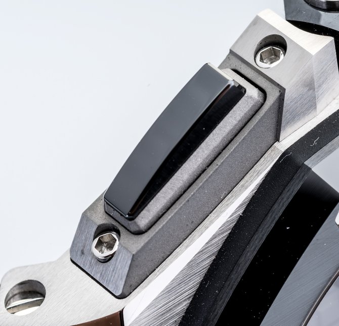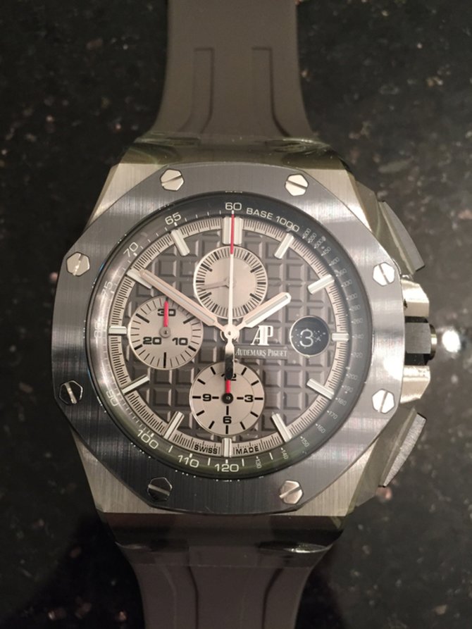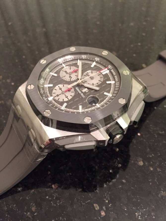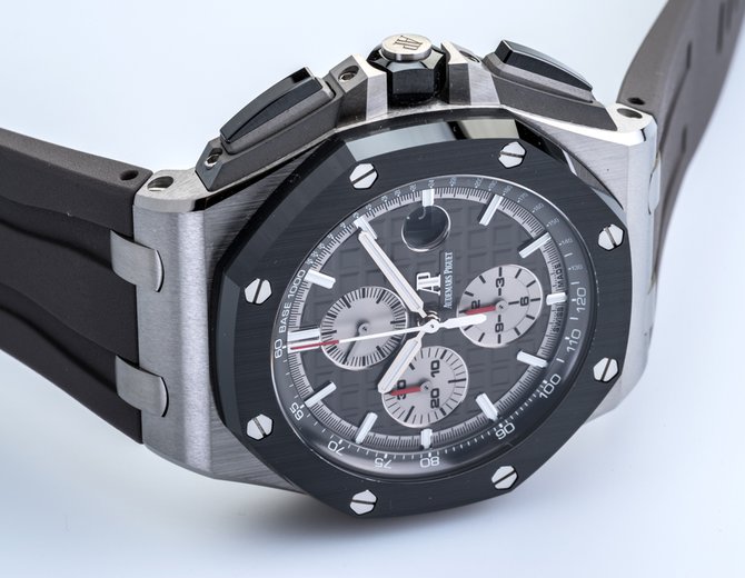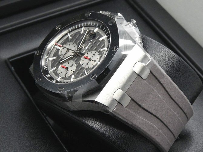 Многофункциональные швейцарские часы представлены компанией-производителем часов люкс-класса - Audemars Piguet, которая основалась еще в 1875 году. Из функций модели можно отметить: 1) индикацию текущего времени; 2) индикацию текущей даты; 3) индикацию данных функции хронографа; 4) тахиметрическую шкалу. Циферблат часов - это ручная работа мастера-гильошера мануфактуры Audemars Piguet. Он накрыт стеклом из натурального сапфира. Каучуковый ремешок оснащен раскладывающейся застежкой. Окно для индикации даты накрыто увеличивающей линзой. Безель из керамики крепится 8-ю винтами. Сам же корпус выполнен из титана. Размеры корпуса: 44 мм х 14.4 мм. Запас хода механизма - 50 часов. Водонепроницаемость корпуса - 100 метров.