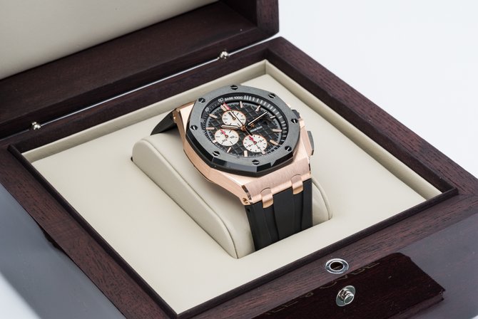 Предлагаем Вам очень стильную и оригинальную модель наручных часов знаменитой швейцарской фирмы Audemars Piguet. Audemars Piguet 26400RO.OO.A002CA.01 Механизм автоматический, Калибр AP 3126/3840 Размеры корпуса 44 x 14.3 мм Корпус розовое золото 18к, керамика Особенности Водостойкие, Хронограф Функции часы, минуты, секунды, дата, тахиметр Циферблат черный, 'Mega Tapisserie' Запас хода 60 часов Ремешок каучук с золотой 18к вставкой Дополнительная информация водонепроницаемость 100 м. Легендарныефабрика Audemars Piguet наручные часы Audemars Piguet (Одемар Пиге) впервые появились в 1875 году в швейцарском городке Ле Брассю. Два абсолютно разных человека, вдохновленные одной идеей и задавшиеся одной целью, создали часовую мануфактуру, которая теперь по праву занимает лидирующую позицию в мире элитных часов с уникальными механизмами. Звали будущих мастеров Эдвард-Огюст Пиге и Жюль-Луи Одемар (Jules Audemars и Edvard Piguet). Собственно говоря, и часовую мануфактуру окрестили по именам ее владельцев - Audemars Piguet. Пиге внес уставный капитал – 10 000 франков – в производство швейцарских часов Audemars Piguet и часовых механизмов. Одемар же вложил 18 усложненных механизмов собственного изготовления. Таким образом, один из них – 23-летний Жюль-Луи Одемар – стал техническим директором фирмы, а 21-летний Эдвард-Огюст Пиге – ответственным за финансовые вопросы компании. Естественно, все это было по обоюдной договоренности сторон. Такой «деловой расклад» - распределение полномочий между представителями двух семей – сохранился до наших дней. Обе фамилии являются владельцами культовой марки наручных часов Audemars Piguet, как и сто лет назад. Сохранение престижа и высочайшего качества швейцарских часов Audemars Piguet и самой компании обеспечивается благодаря верности семейным традициям. Однако пришлось много потрудиться, прежде чем к ним пришел заслуженный успех. В нашем интернет магазине Вы можете вс