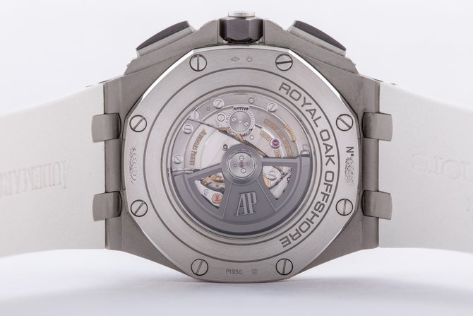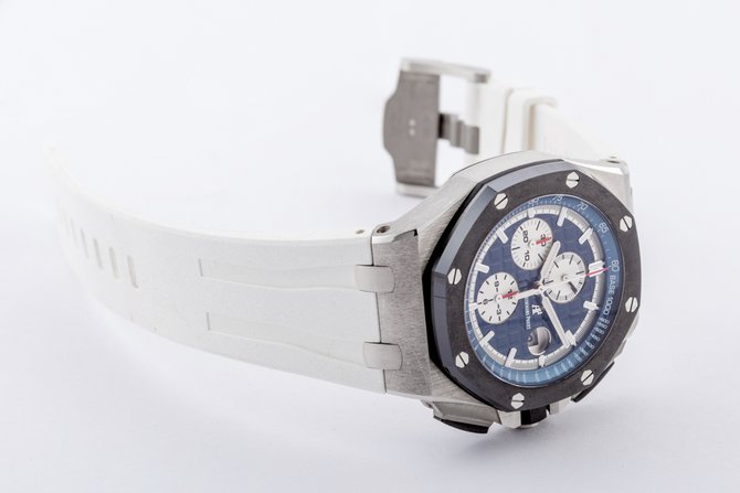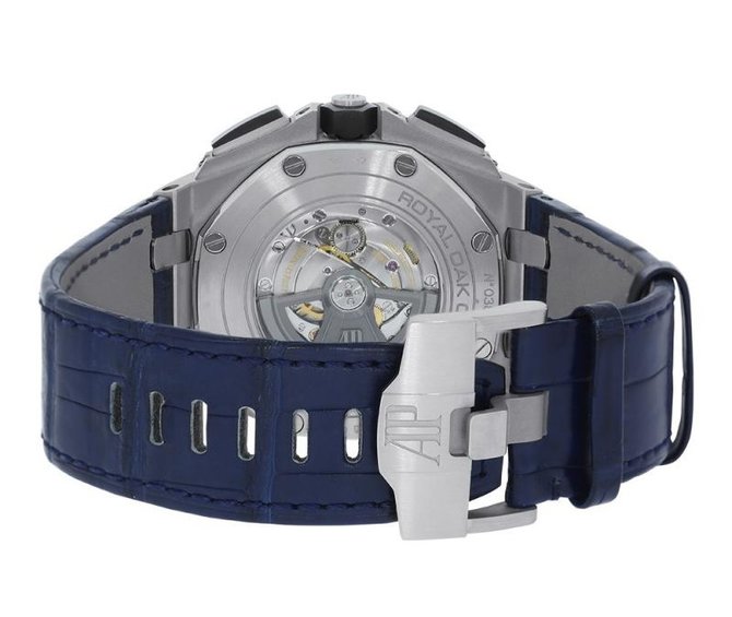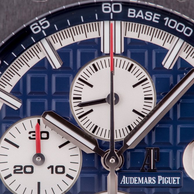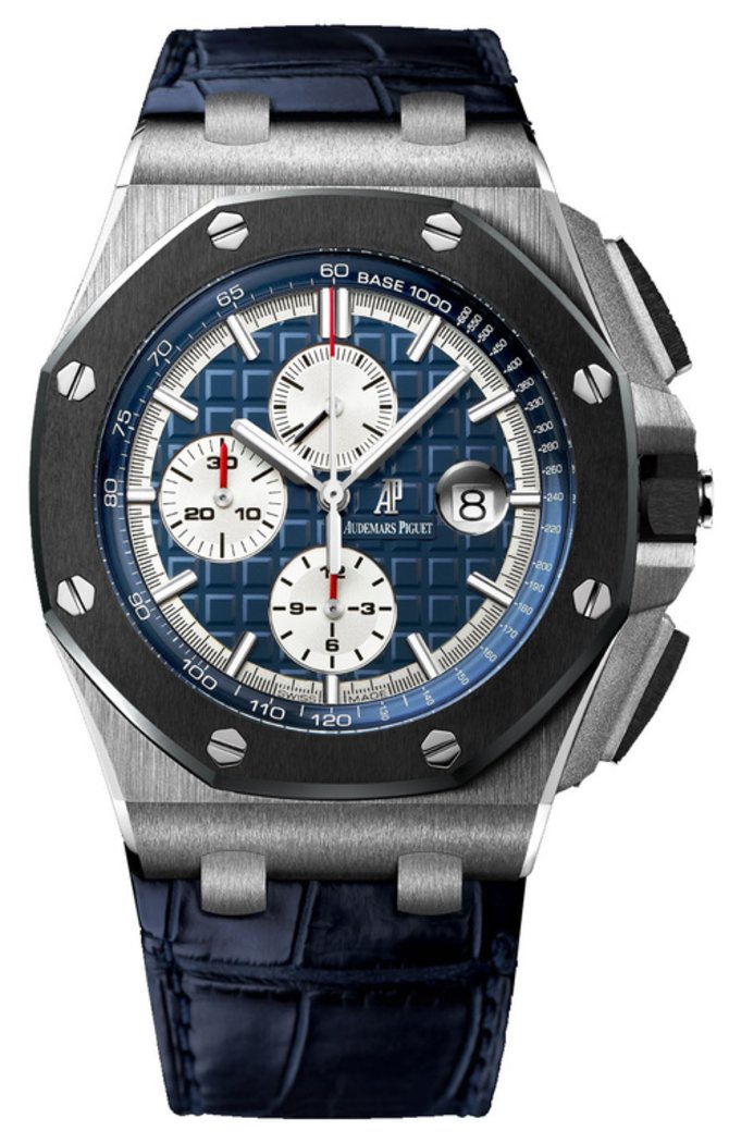 Мужские механические с автоподзаводом наручные часы Audemars Piguet Royal Oak Offshore Chronograph. Функции: часы, минуты, маленький секундный циферблат на позиции 12 часов, поле даты на позиции 3 часа, хронограф с 12-часовым (на позиции 6 часов) и 30-минутным (на позиции 9 часов) счетчиками и центральной секундной стрелкой. Корпус наручных часов Audemars Piguet Royal Oak Offshore Chronograph выполнен из платины 950 пробы. Черный керамический безель. Заводная коронка и кнопки с винтовой блокировкой. Защита кнопок из платины. Синий циферблат с узором «Méga Tapisserie». Посеребренные счетчики и шкала. Часовые маркеры и стрелки из белого золота с люминесцентным покрытием. Синий внутренний безель с тахометрической шкалой. Сапфировое стекло с антибликовым покрытием. Прозрачная задняя крышка корпуса из сапфирового стекла. Синий ремешок из крокодиловой кожи ручной работы с застежкой из платины 950 пробы. Хронограф с автоматическим заводом. Калибр 3126 / 3840. Частота колебаний баланса 3 Гц. Запас хода 55 часов. Водонепроницаемые до 100 м.