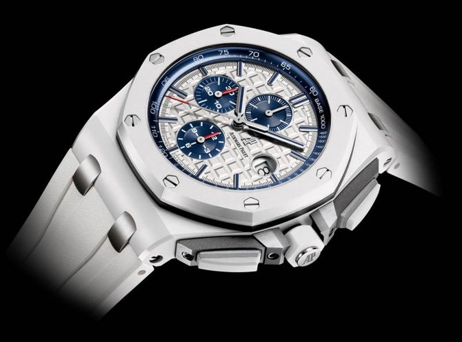 Новинка 2014г. Коллекция Royal Oak Offshore легендарной часовой марки Audemars Piguet на выставке SIHH 2014 была дополнена хронографом Royal Oak Offshore Chronograph 44 mm. Не секрет, что основное преимущество керамики заключается в ее долговечности и твердости. Но высокая твердость увеличивает время его обработки. Для изготовления такого корпуса требуется 12 часов, а для изготовления безеля – 8 часов. Часы Royal Oak Offshore Chronograph 44 mm, как и следует из названия, имеют керамический корпус диаметром 44 мм. Дополняет корпус фиксированный безель на 8 винтах. Водонепроницаемость – 100 метров. Циферблат светло - серебристого цвета с отделкой Méga Tapisserie оснащен накладными часовыми индексами и стрелками из белого золота с люминесцентным покрытием. Кончик секундной стрелки выкрашен в красный цвет. В положении «3 часа» расположена круглая апертура даты, а у меток 12, 6 и 9 размещены счетчики. На фланце циферблата находится тахиметрическая шкала. Защищает циферблат сапфировое стекло с антибликовым покрытием. Сапфировое стекло установлено также на титановой задней крышке. Хронограф оснащен автоматическим калибром Audemars Piguet 3126/3840 мануфактурного производства. Калибр диаметром 29,92 мм и толщиной 7,16 мм состоит из 365 деталей, собран на 59 камнях, оснащен частотой 21 600 полукоелбаний в час, а также 55-часовым запасом хода. Механизм оснащен также скелетонированным ротором автоподзавода из 22-каратного золота на керамических подшипниках с гальваническим покрытием антрацитового цвета и функциями: часы, минуты, секунды, дата, хронограф. Дополняет модель белый каучуковый ремешок с титановой застежкой.