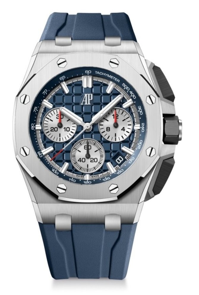 Компания из Швейцарии Audemars Piguet представляет наручные часы Royal Oak Offshore Selfwinding Chronograph 43 mm Ref. 26420TI.OO.A027CA.01. Корпус из титана c безелем, зафиксированным титановыми винтами, выполнен в диаметре 43 мм. Каучуковый ремень синего цвета дополнен титановой вставкой. С лицевой стороны корпуса установлено сапфировое стекло с двусторонним антибликовым покрытием. Синий гильошированный циферблат оснащен накладными часовыми метками и стрелками с люминесцентным покрытием. Установленный калибр 4401 с автоподзаводом обладает 70-часовым запасом хода. Основная функция этих часов - функция хронографа. Водонепроницаемость корпуса рассчитана на 50 метров.