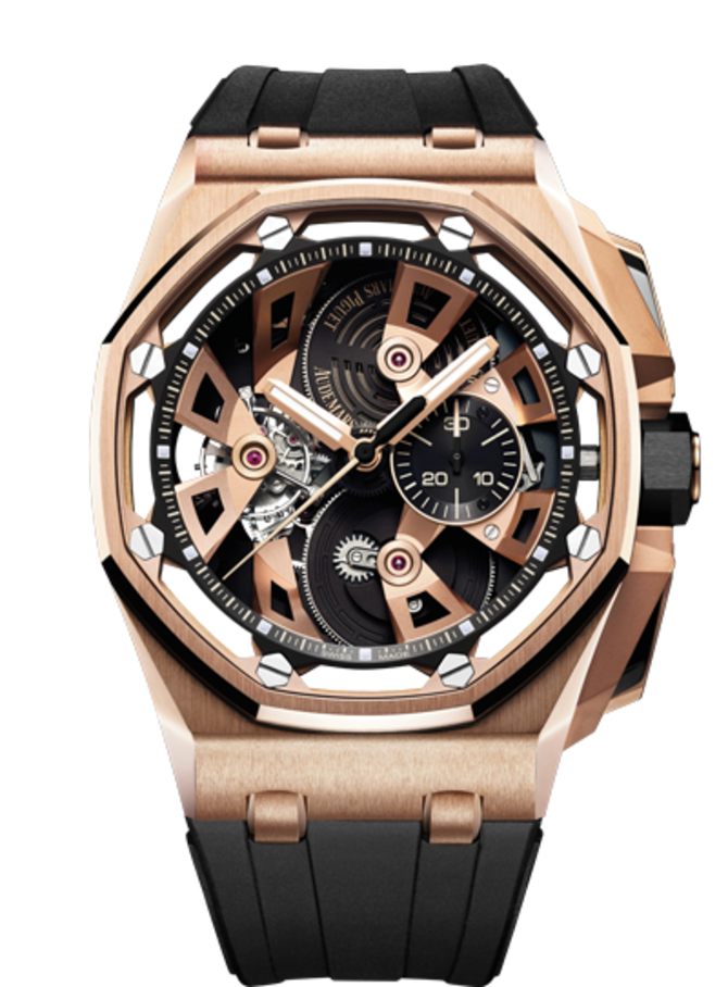 Швейцарские часы из 18-каратного золота представлены в честь 25-летия Royal Oak Offshore ограниченной серией. Механизм мануфактурной разработки, что отличается авангардным духом современной архитектуры, работает от ручного подзавода. Задняя крышка и защитное стекло - сапфировый кристалл. Безель из нержавеющей стали, черная керамическая втулка с завинчивающейся головкой и наконечники, защитные чехлы из титана. На черном циферблате-скелетоне расположены стрелки из белого золота с люминесцентным покрытием. Модель комплектуется черным каучуковым браслетом и нержавеющей стальной пряжкой.