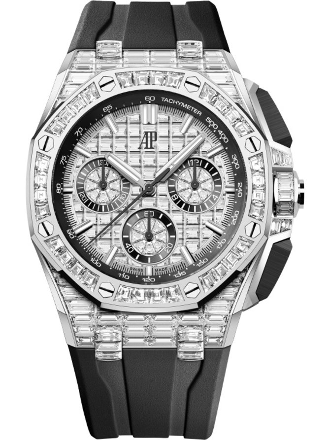 Швейцарский хронограф 2023 года Royal Oak Offshore Selfwinding Chronograph (ref. 26425BC.ZZ.D002CA.02) от Audemars Piguet выполнен в корпусе из белого золота, размером 43 мм, что инкрустирован бриллиантами багетной огранки. В комплекте поставляется черный каучуковый ремешок с пряжкой из белого золота, тоже инкрустированной бриллиантами. 80 бриллиантов багетной огранки; ~8,2 карата на корпусе. 32 бриллианта багетной огранки; ~ 1,4 карата (безель). 106 бриллиантов багетной огранки; ~8,4 карата (циферблат). 12 бриллиантов багетной огранки; ~1,2 карата (пряжка).