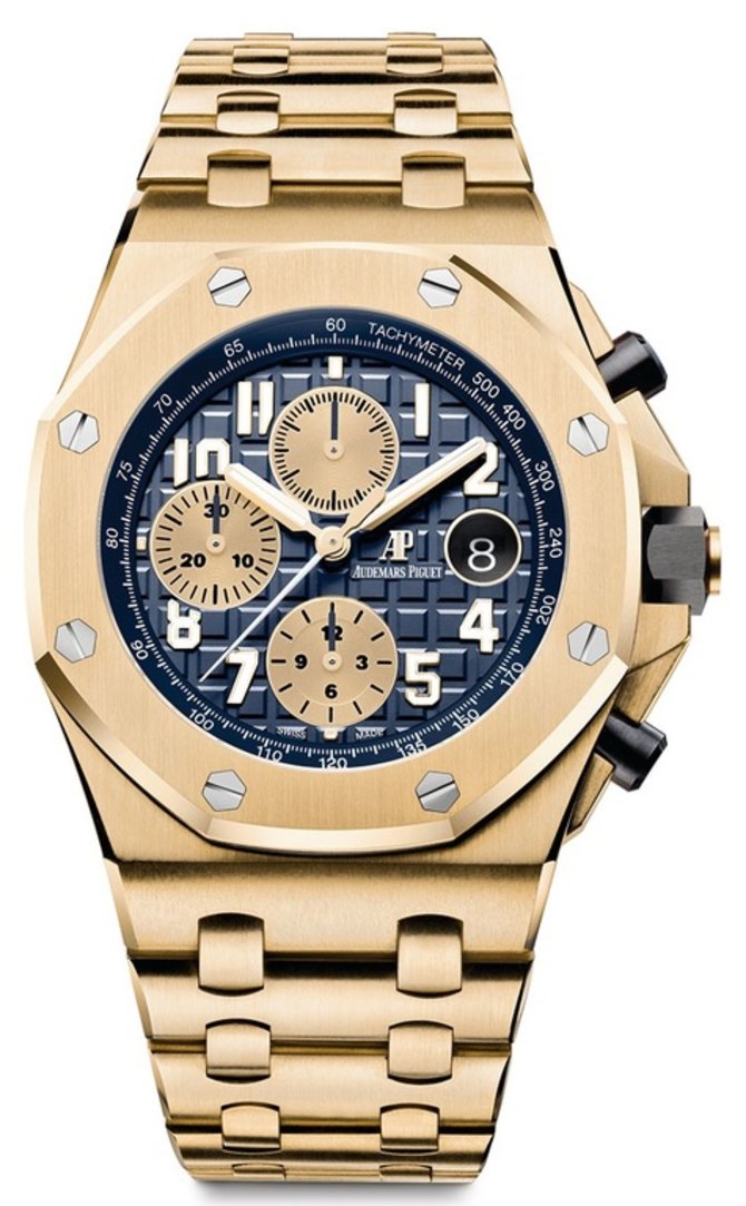 В корпусе из желтого 18-каратного золота, выполненном в характерном для Audemars Piguet стиле, инженерами мануфактуры установлена собственная разработка - Калибр AP 3126/3840 с автоматическим подзаводом, хронографом, запасом хода - 50 часов, индикацией часов, минут, секунд и даты. На циферблате синего цвета с крупным гильошированием вручную также расположены счетчики хронографа и тахиметрическая шкала. Безель в форме гайки закреплен на золотом корпусе 8-ю винтами. Браслет из желтого 18-каратного золота оснащен раскладывающейся застежкой. Производитель заявил о 100-метровой герметичности корпуса. Диаметр корпуса - 42 мм; толщина - 14.55 мм. Часовые индексы с люминесцентным покрытием.