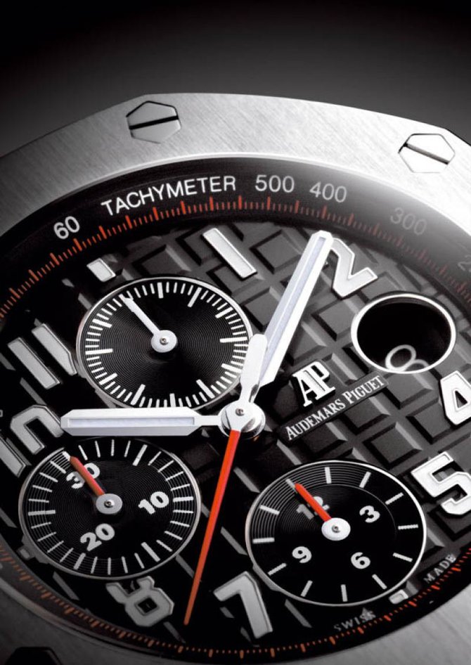 Новинка 2014. Компания Audemars Piguet в 2014 году порадовала своих поклонников обновив свою популярнейшую коллекцию Royal Oak Offshore моделями Chronograph в 42мм корпусе. Шесть новых версий Royal Oak Offshore были представлены на выставке SIHH 2014 в Женеве. Две в розовом золоте и четыре в стали. Изменения коснулись безеля, который теперь выполнен из того материала что и корпус. Кнопки хронографа и заводная головка теперь керамические (раньше они были с резиновым покрытием), также незначительное изменение формы корпуса. Диск даты теперь выполнен в цвет циферблата. Стройнее стали арабские часовые метки, а также часовая и минутная стрелки теперь более широкие. Порадовала и задняя крышка часов которая теперь из сапфирового стекла и можно наблюдать за работой мануфактурного автоматического механизма Audemars Piguet 3126/3840, который состоит из 365 деталей, собран на 59 драгоценных камнях, работающий на частоте 21 600 полуколебаний в час, имеет 55 часов запас хода. Особой красоты придает скелетонированный ротор автоподзавода из 22-каратного золота на керамических подшипниках. Модель Ref: 26470ST.OO.A027CA.01 поставляется на каучуковом ремне синего цвета, Модели Ref:26470ST.OO.A104CR.01, Ref: 26470ST.OO.A801CR.01, Ref: 26470ST.OO.A101CR.01, Ref.: 26470OR.OO.A002CR.01 поставляются на сшитых вручную ремешках из кожи крокодила, под фирменным названием "Hornback". последняя модель Ref.: 26470OR.OO.1000OR.01 поставляется на браслете из розового золота 18К.