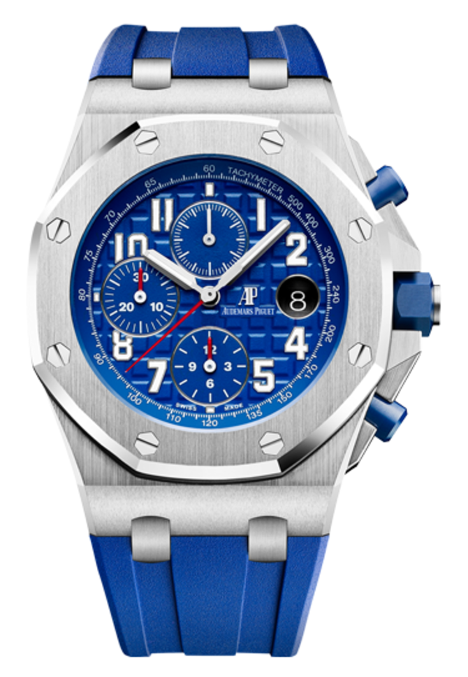 Яркая синяя модель швейцарских механических часов с хронографом ROYAL OAK OFFSHORE SELFWINDING CHRONOGRAPH от компании со швейцарским авторитетом Audemars Piguet имеет корпус круглой формы из полированной стали, причем полировка осуществлялась вручную, диаметром 42 мм. Часы рассчитаны на погружение под воду до 100 метров глубины. Мануфактурный механизм с усложнением спортивного типа - хронографом, созданным для измерения промежутков времени. На гильошированном мастером циферблате указываются часы, минуты, секунды и дата. На субциферблатах отображаются данные хронографа. Ремень каучуковый. Застежка раскладного типа. Стекло сапфировое, устойчивое к царапинам и бликам солнца.