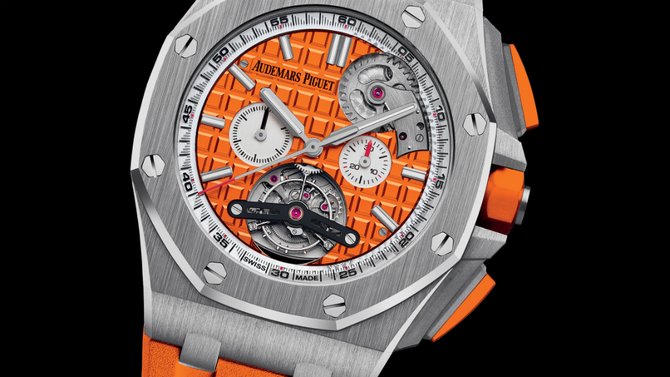 Стильная модель в оранжевом цвете имеет два важных усложнения - турбийон и хронограф. Турбийон служит для нивелирования земной гравитации и повышения точности хода, а хронограф дает возможность фиксировать промежутки времени. Окно турбийона скелетонизированное. Калибр 2897, установленный в этих часах - мануфактурная разработка бренда Audemars Piguet. Корпус выполнен из качественной матовой нержавеющей стали. Стекло сапфировое способно защитить циферблат от любого повреждения. Корпус имеет высокий уровень герметичности - 100 метров. Запас хода механизма - 65 часов. Модель Tourbillon Chronograph Selfwinding 26540ST.OO.A070CA.01 пополнила коллекцию Royal Oak Offshore.
