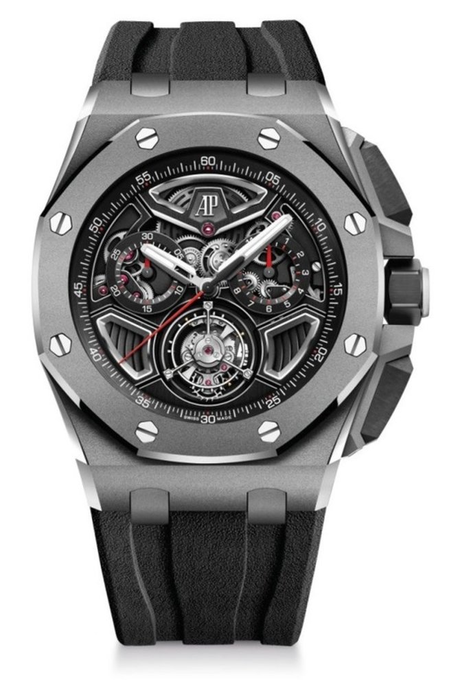 Швейцарская часовая мануфактура Audemars Piguet представляет водостойкие наручные часы с турбийоном и хронографом Royal Oak Offshore Selfwinding Flying Tourbillon Flyback Chronograph Ref. 26622TI.GG.D002CA.01 в корпусе из титана, диаметром 43 мм. С лицевой и оборотной стороны корпуса установлено сапфировое стекло с антибликовым покрытием. Размер корпуса - 43 мм. Водонепроницаемость корпуса рассчитана на 100 метров. На скелетонированном циферблате показываются часы и минуты, данные хронографа, а также окно турбийона. Каучуковый ремень черного цвета оснащен титановой застежкой. Установленный калибр 2967 с автоподзаводом обладает 65-часовым запасом хода. Модель выпущена лимитированной серией - 100 экземпляров.