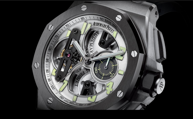 Коллекционные швейцарские часы с турбийоном и хронографом, выпущенные ограниченным тиражом в 15 экземпляров мануфактурой Audemars Piguet. Корпус данных часов выполнен из титана. Керамический безель зафиксирован 8-ю титановыми винтами. Характеристики корпуса: герметичность - 100 метров; диаметр - 44 миллиметра; толщина - 14.9 миллиметров. Частично скелетонизированный серебристый циферблат указывает текущее время и данные хронографа. Для полноценной индикации данных в темное время суток применено люминесцентное покрытие. Черный каучуковый ремешок с титановой раскладывающейся застежкой AP - в комплекте. Мануфактурный швейцарский калибр с турбийоном и хронографом AP 2912, установленный внутри корпуса, обладает частотой 3.00 Гц (21'600 пк/час) и запасом хода в 237 часов. Он состоит из 328 элементов, из которых 30 - драгоценные камни. Корпус с двух сторон защищен сапфировым стеклом.
