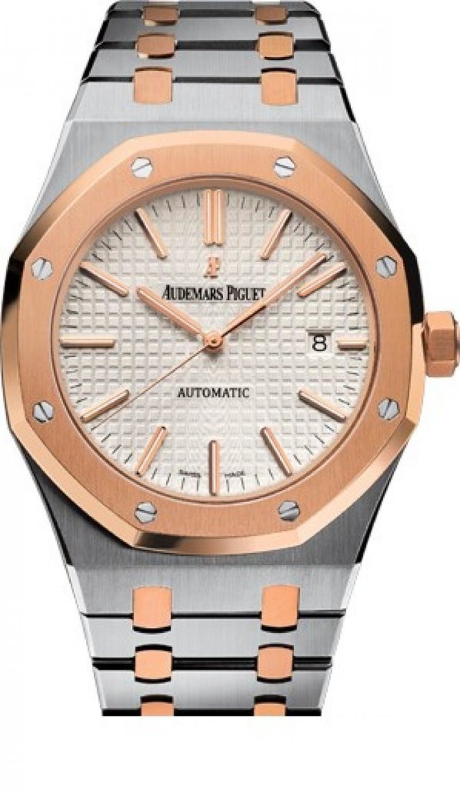 Водостойкие мужские наручные швейцарские часы от популярной в часовой индустрии компании Audemars Piguet. Корпус модели, диаметром 41 мм и толщиной - 9.5, комбинированный, произведен из нержавеющей стали и розового золота. Водонепроницаемость комбинированного корпуса способна защитить часовой механизм с автоподзаводом, калибр AP3120, под давлением до 300 метров глубины. Запас хода часов - 60 часов, что равняется 1,5 суток. Циферблат гильоширован, цвета слоновой кости. Отображает стандартный набор функций - часы, минуты, секунды, а также имеет индикатор даты. Механизм, кроме защиты корпусом, еще находится под защитой двухстороннего сапфирового стекла, т.е. стекло установлено и на лицевой, и на задней стороне корпуса. Это говорит о том, что владелец на досуге имеет возможность оценить работу Калибра AP3120 с помощью просвещающейся задней крышки. В историю бренда вписал свое имя и американская кинозвезда Арнольд Шварценеггер. На его запястье можно лицезреть наручные часы от Audemars Piguet в художественном фильме «Терминатор 3: Восстание машин». Выпуск швейцарских наручных часов-хронографов Royal Oak City of Sailsа бренд посвятил обладательнице Кубка Америки-2003 яхте Alinghi из Швейцарии, а ограниченную серию Royal Oak Automatic в размере 30 моделей – Нику Фальдо, популярному гольфинисту. На роторе этих часов была личная подпись чемпиона мира по гольфу. С 1999-го года часовой бренд Audemars Piguet - официальный спонсор кубка по скачкам под названием «Queen Elizabeth II Cup». Помимо этого весомого вклада в спортивный мир, Audemars Piguet еще является спонсором команды по парусному спорту под названием «Alinghi Sailing Team». Циферблат гильоширован, цвета слоновой кости. Отображает стандартный набор функций - часы, минуты, а также имеет индикатор даты. К часам в комплекте полагается также комбинированный браслет, выполненный из нержавеющей стали и розового золота.