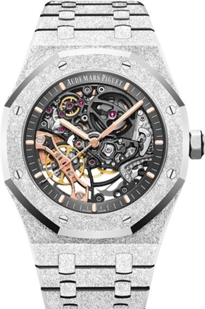 Швейцарские часы от мануфактуры Audemars Piguet выпущены в корпусе из белого золота с пескоструйной обработкой. В комплекте с золотым корпусом идет браслет из белого золота. Сквозь натуральное сапфировое стекло с антибликовыми свойствами на скелетонированном циферблате показываются часы, минуты и секунды. Часы работают от мануфактурного калибра 3132, установленного внутри корпуса, с автоматическим подзаводом и запасом хода, рассчитанным на 45 часов. Размер корпуса: 41 х 10 мм. Водонепроницаемость корпуса - 50 метров. На стрелках из розового золота находится люминесцентный состав для индикации данных в темноте. Модель Royal Oak Double Balance Wheel Openworked часовая мануфактура Audemars Piguet выпустила в 2019 году.