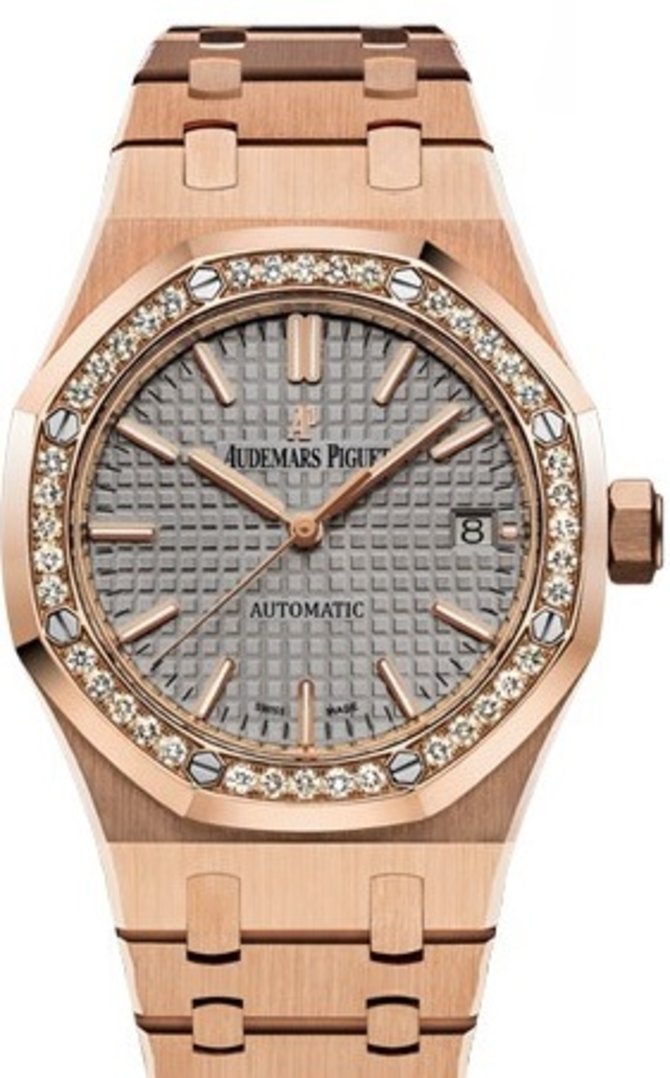 Коллекция Royal Oak от швейцарской фирмы Audemars Piguet является самой популярной в мире. Представленная модель Selfwinding 37 mm великолепна внешне и своими техническими характеристиками. Корпус с восьмиугольным безелем выполнен из 18-каратного розового золота. Безель, декорированный бриллиантами, надежно крепиться к корпусу с помощью восьми винтов. Часы наделены механизмом с автоподзаводом калибр 3120. Этот механизм обеспечивает точность и надежность в работе при любых условиях эксплуатации. Часы водостойкие. Серый циферблат с узором "Grande Tapisserie" защищен сапфировым стеклом от попаданий пыли и от царапин. Золотые центральные стрелки указывают на часы, минуты, секунды. На трех часах размещен цифровой указатель даты. Показания часов легко считываются. Часы комплектуются браслетом из 18-каратного розового золота.