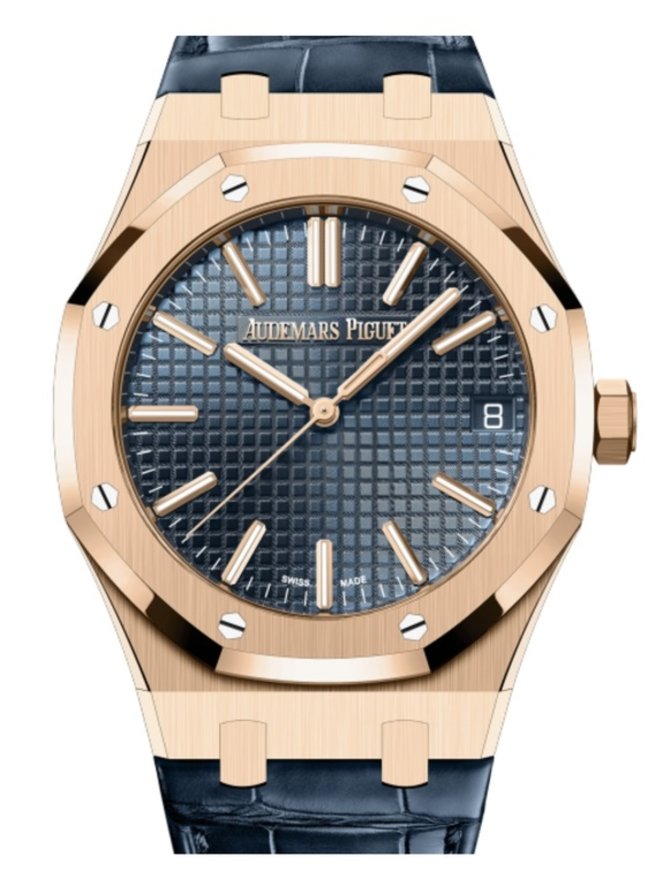 Швейцарские часы для мужчин представлены компанией Audemars Piguet в 2023 году в корпусе из розового 18-каратного золота. Форма корпуса модели Royal Oak Selfwinding 41 mm 15510OR.OO.D315CR.02 характерна для коллекции Royal Oak. Диаметр корпуса - 41 мм. Гильошированный циферблат, накрытый стеклом из сапфирового кристалла, показывает часы, минуты, секунды, дату. На часовые метки и стрелки нанесен люминесцентный состав для возможности считывания показаний в условиях темноты. Ремешок из кожи аллигатора синего цвета браслет дополнен золотой застежкой. Установленный мануфактурный механизм с автоматическим подзаводом (калибр 4302) отличается запасом хода на 70 часов. Корпус герметичен до 50 метров глубины.