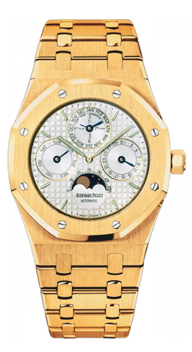 Механизм – автоматический. Функции - часы, минуты, дата, день недели, месяц, фаза луны, цикл високосного года, вечный календарь. Диаметр корпуса – 39 мм. Толщина корпуса – 9.3 мм. Запас хода - 40 часов. Браслет - желтое золото 18к. Застежка - откидная застёжка. ЧЛегендарныефабрика Audemars Piguet наручные часы Audemars Piguet (Одемар Пиге) впервые появились в 1875 году в швейцарском городке Ле Брассю. Два абсолютно разных человека, вдохновленные одной идеей и задавшиеся одной целью, создали часовую мануфактуру, которая теперь по праву занимает лидирующую позицию в мире элитных часов с уникальными механизмами. Звали будущих мастеров Эдвард-Огюст Пиге и Жюль-Луи Одемар (Jules Audemars и Edvard Piguet). Собственно говоря, и часовую мануфактуру окрестили по именам ее владельцев - Audemars Piguet. Пиге внес уставный капитал – 10 000 франков – в производство швейцарских часов Audemars Piguet и часовых механизмов.